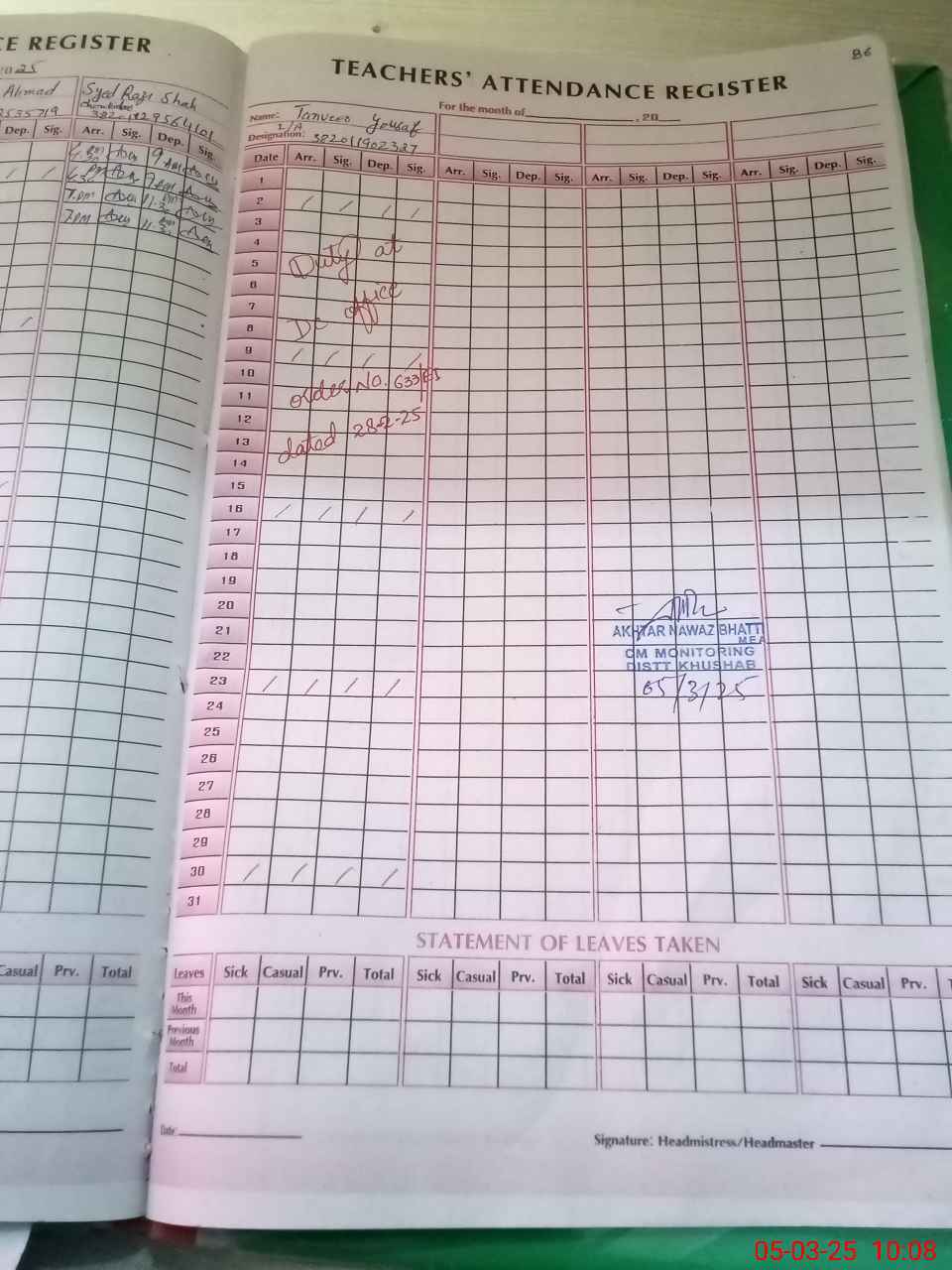 | 38**** | Sh**** Ya**** | PST | Regular | 0 | 0 | 0 | 0 | 0 | 0 | 0 | 0 | 0 | Exam Duty |