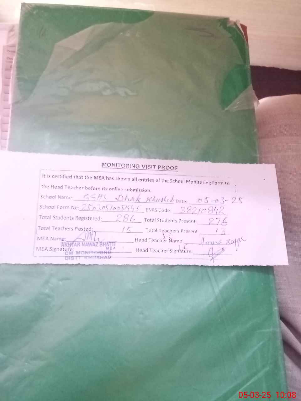 | Attendance Register | Head Teacher | MEA with School | Visit Proof |