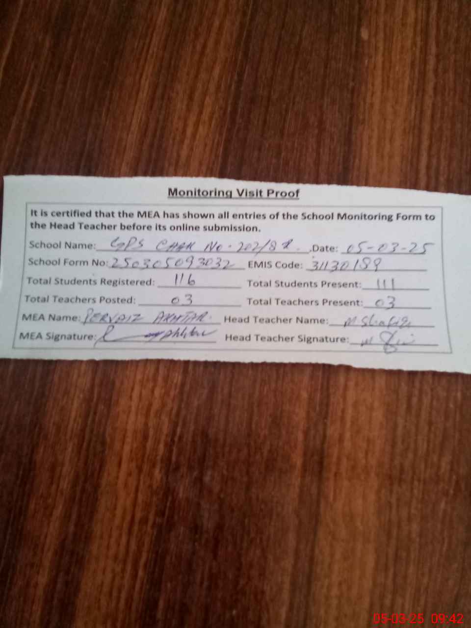 | Attendance Register | Head Teacher | MEA with School | Visit Proof |