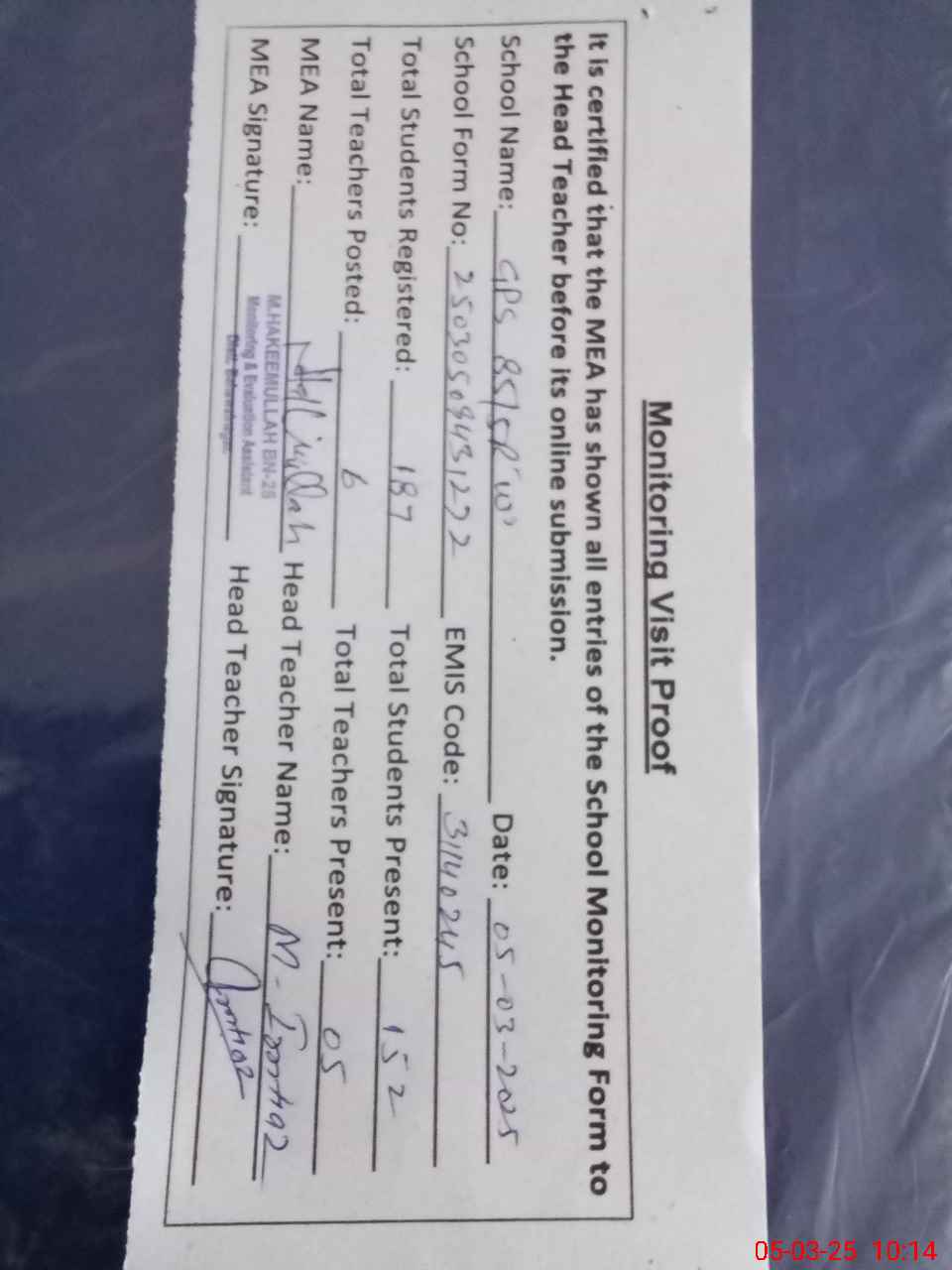 | Attendance Register | Head Teacher | MEA with School | Visit Proof |