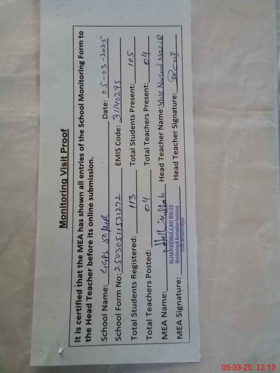 | Attendance Register | Head Teacher | MEA with School | Visit Proof |