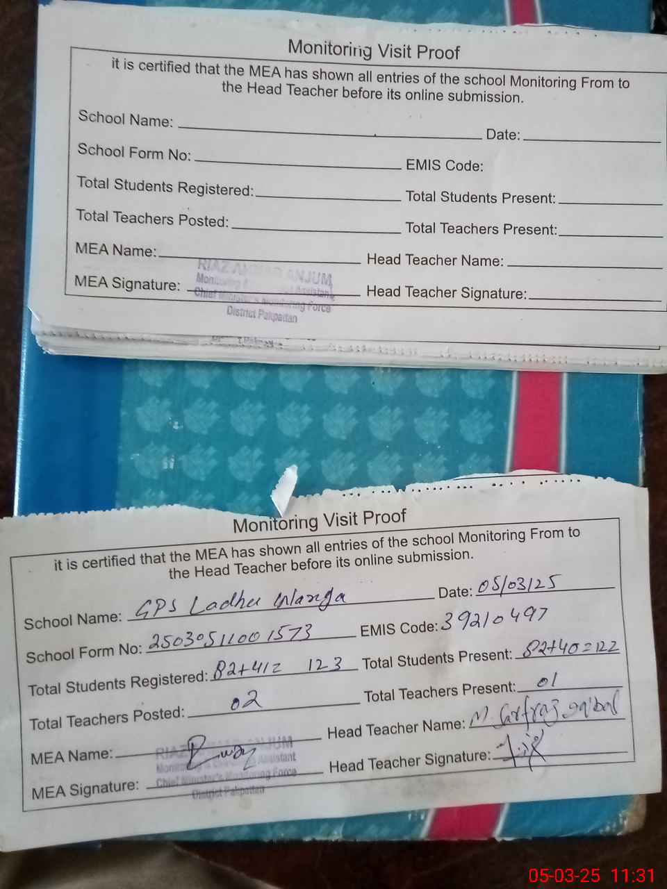 | Attendance Register | Head Teacher | MEA with School | Visit Proof |