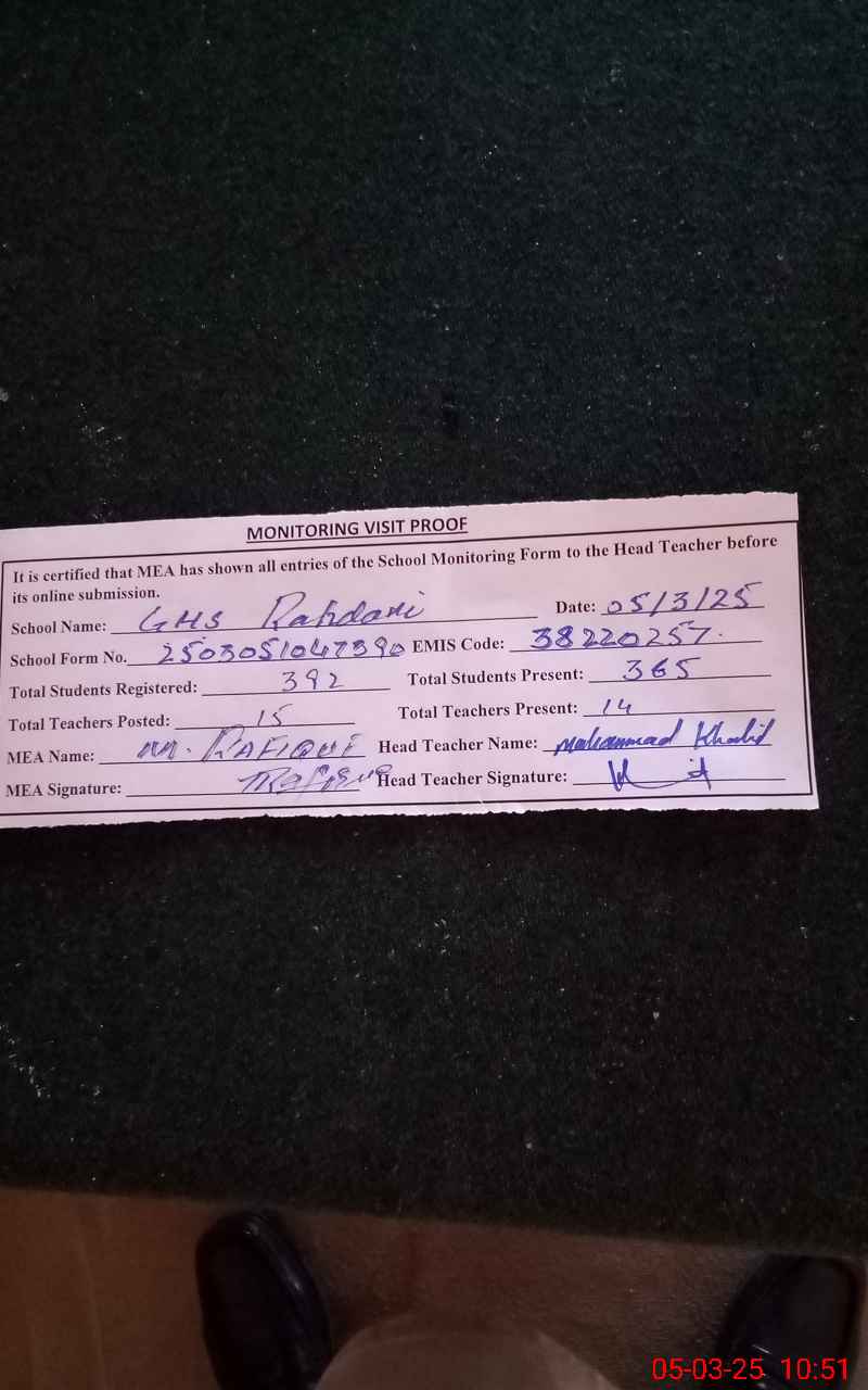 | EMIS Code: 38220257 | Name of School: GHS RAHDARI | |||