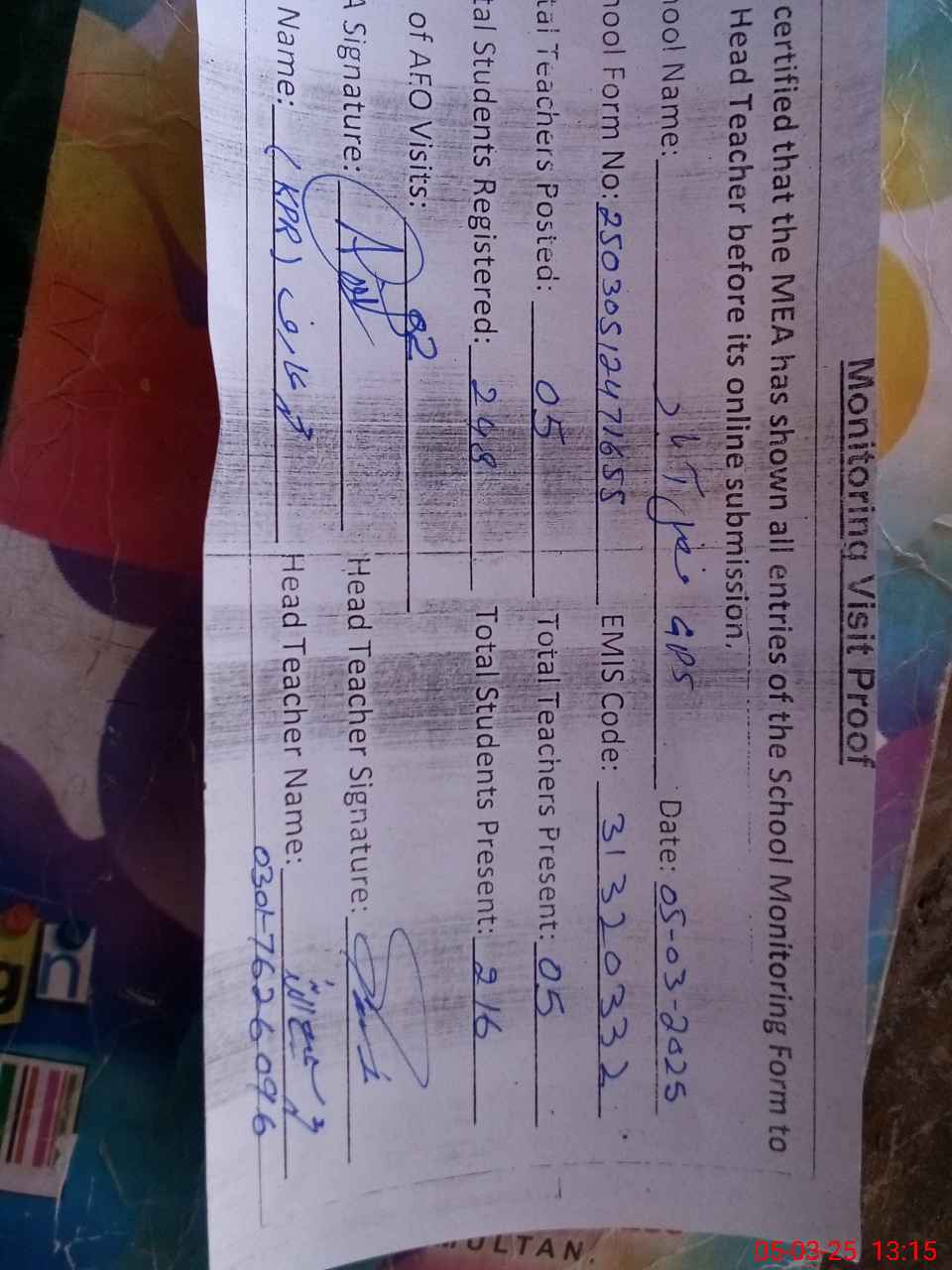 | Name: Mu**** Sa**** Designation: (School Headmaster's/Headmistress's) PST/PTC/JV Phone/Cell Number: 03**** |