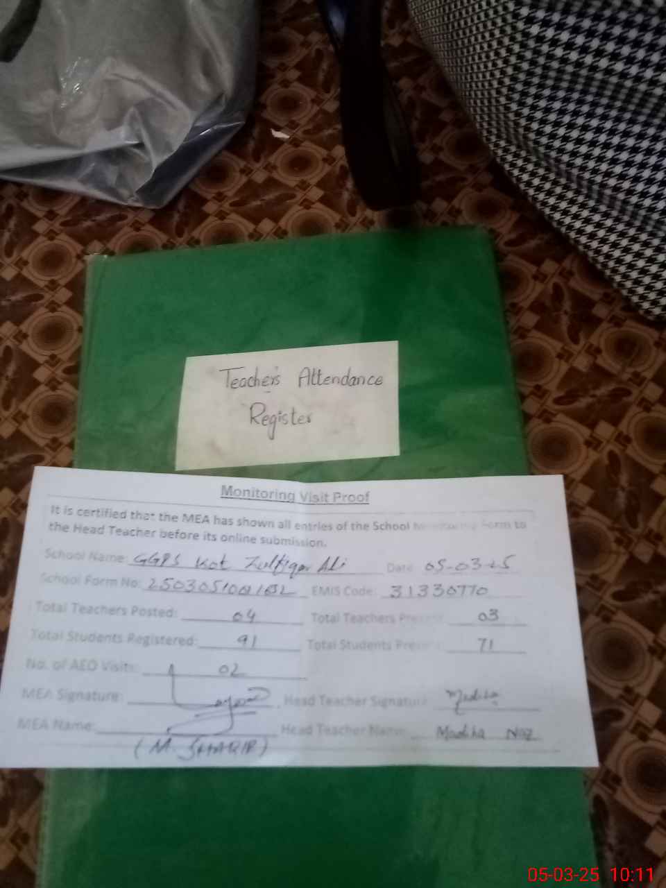 | Attendance Register | Head Teacher | MEA with School | Visit Proof |
