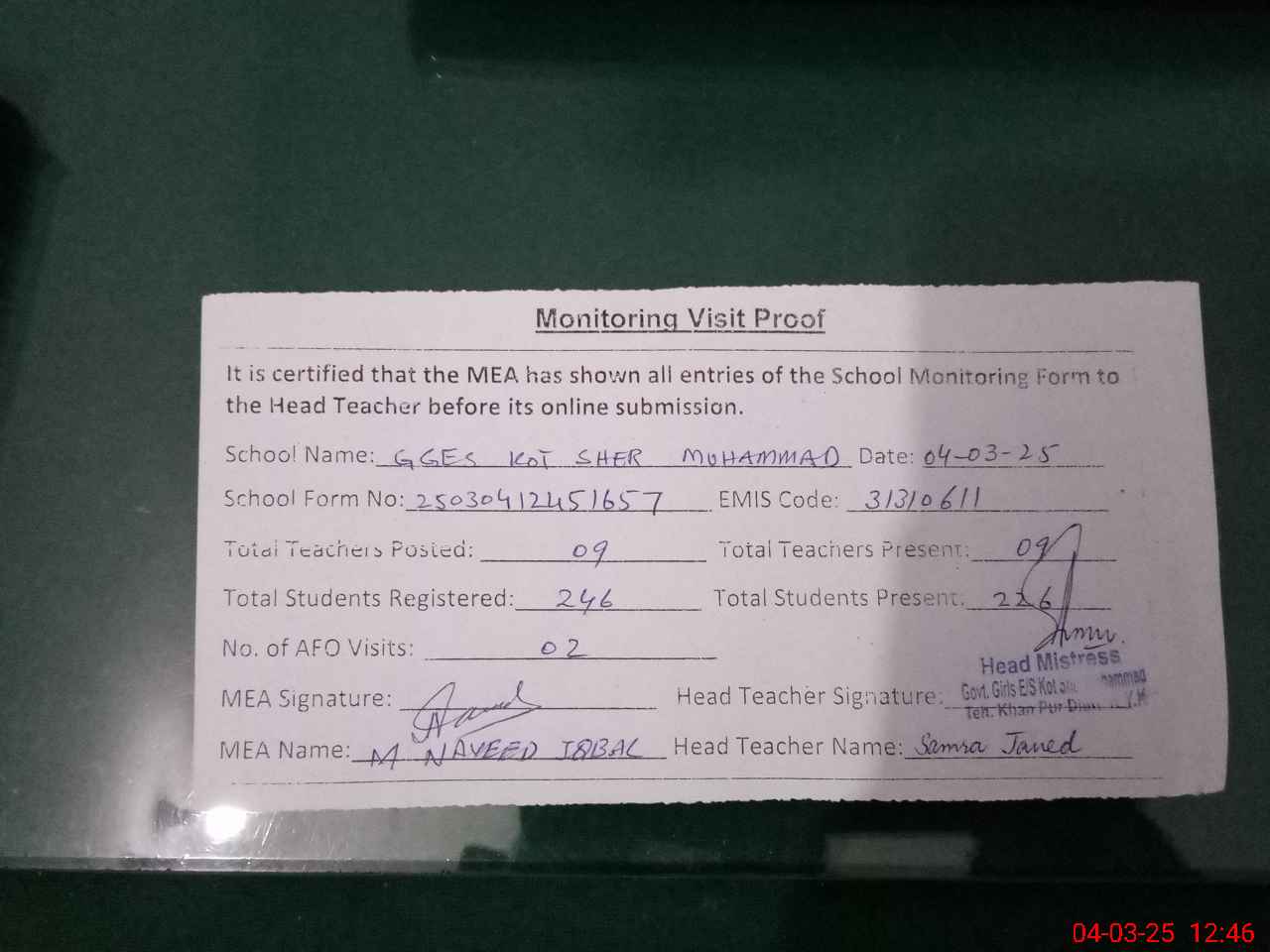 | EMIS Code: 31310611 | Name of School: GGES KOT SHER MOHAMMAD | |||