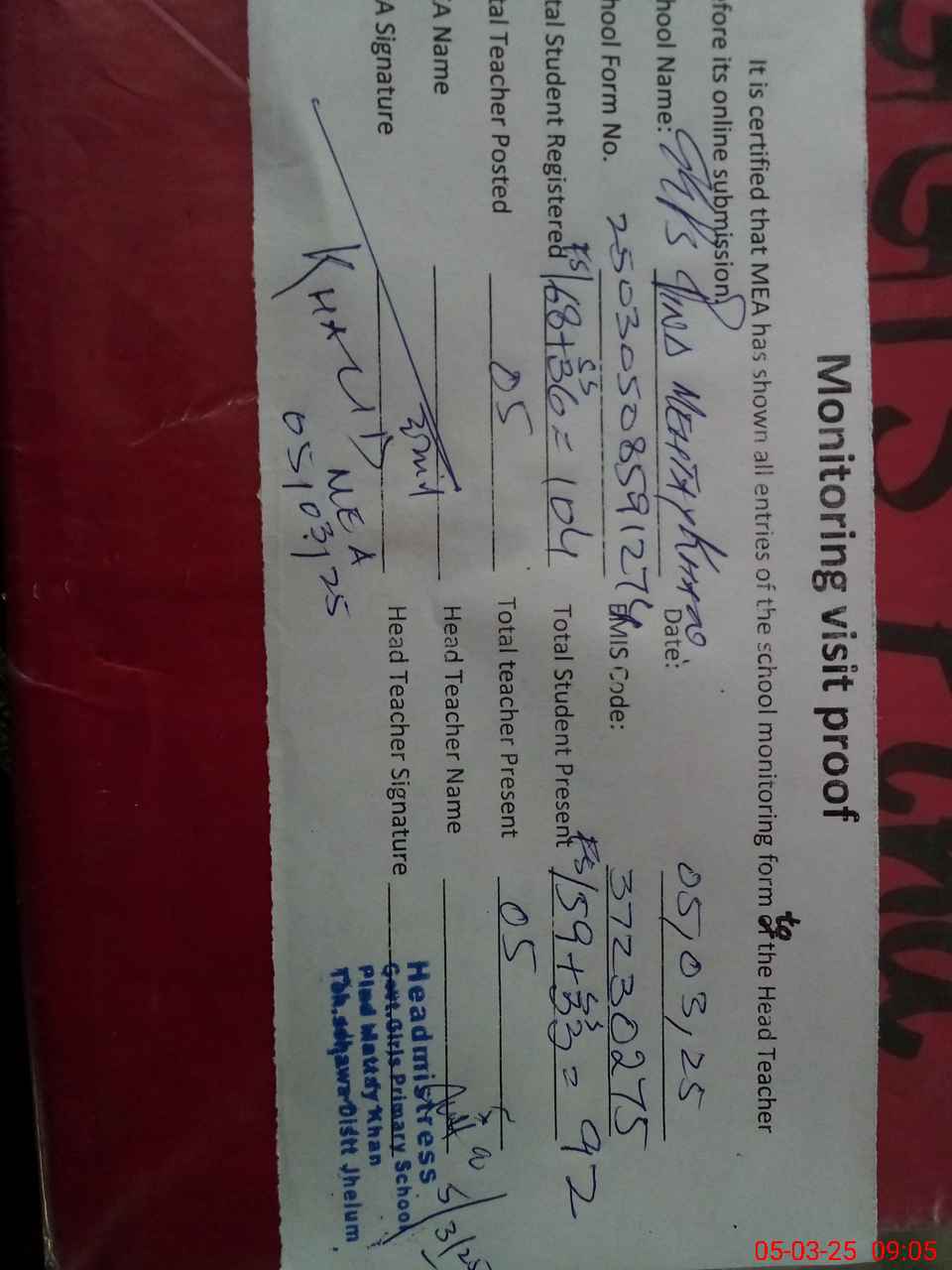 | Attendance Register | Head Teacher | MEA with School | Visit Proof |