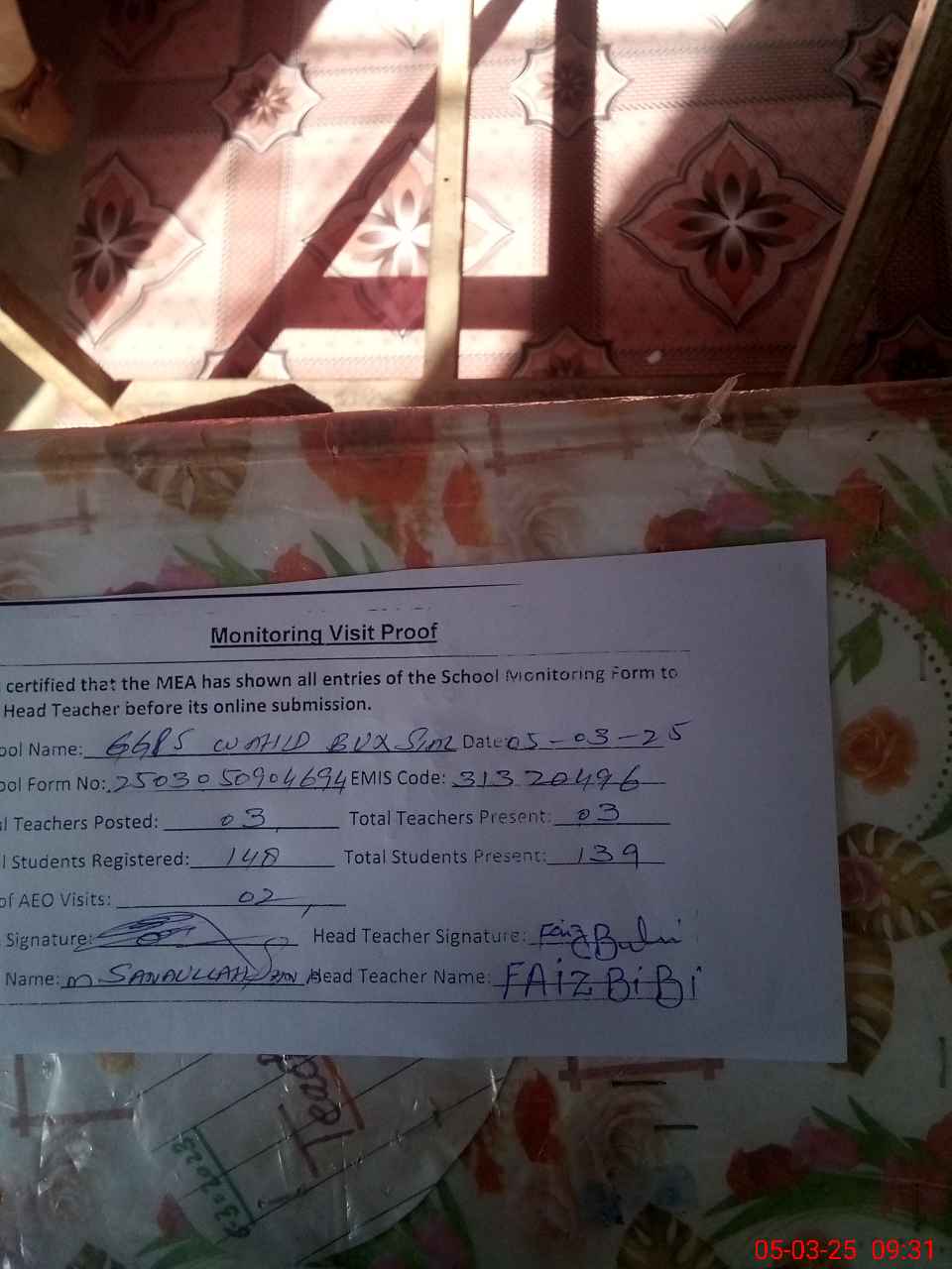 | Attendance Register | Head Teacher | MEA with School | Visit Proof |