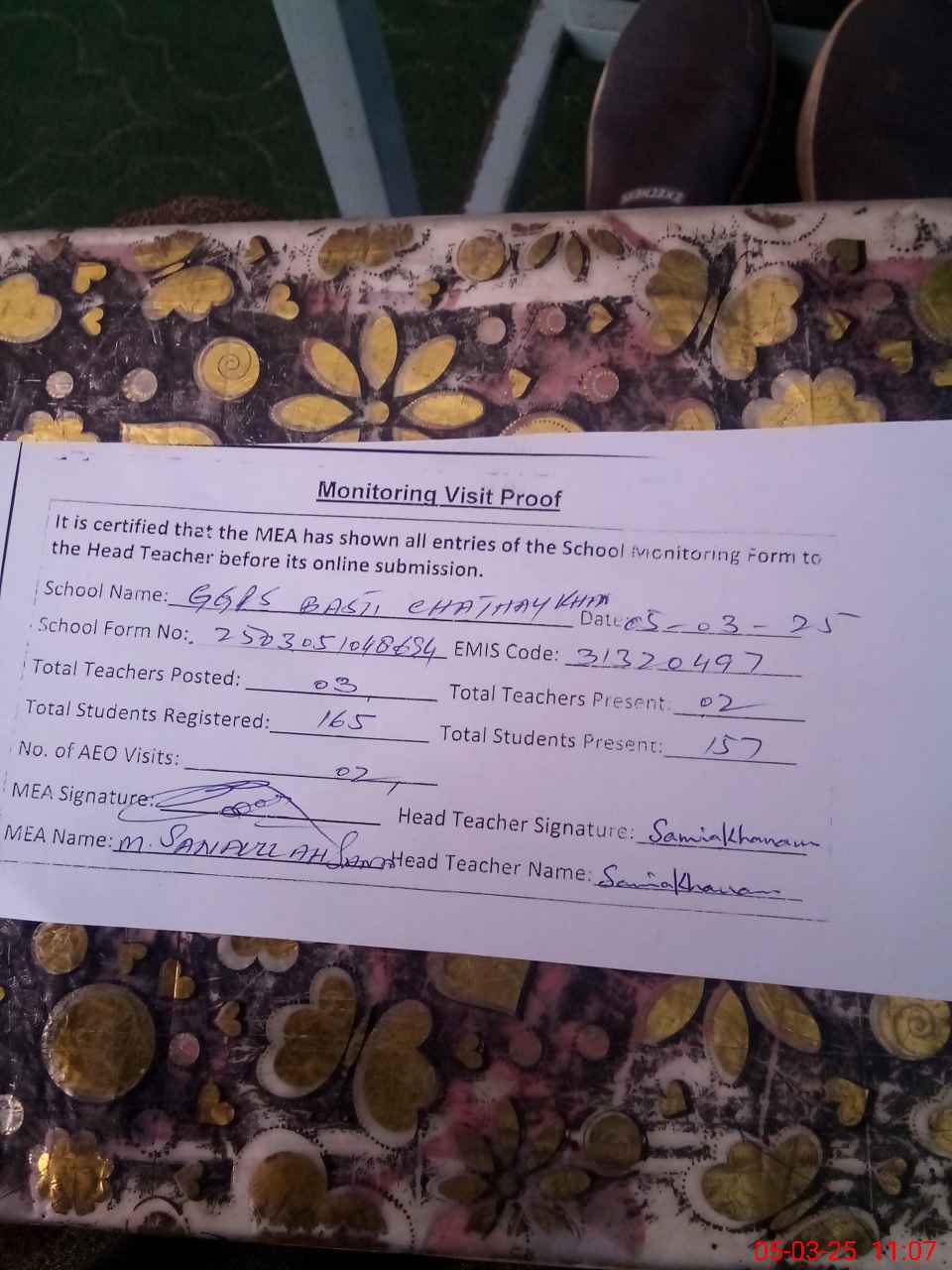 | Attendance Register | Head Teacher | MEA with School | Visit Proof |