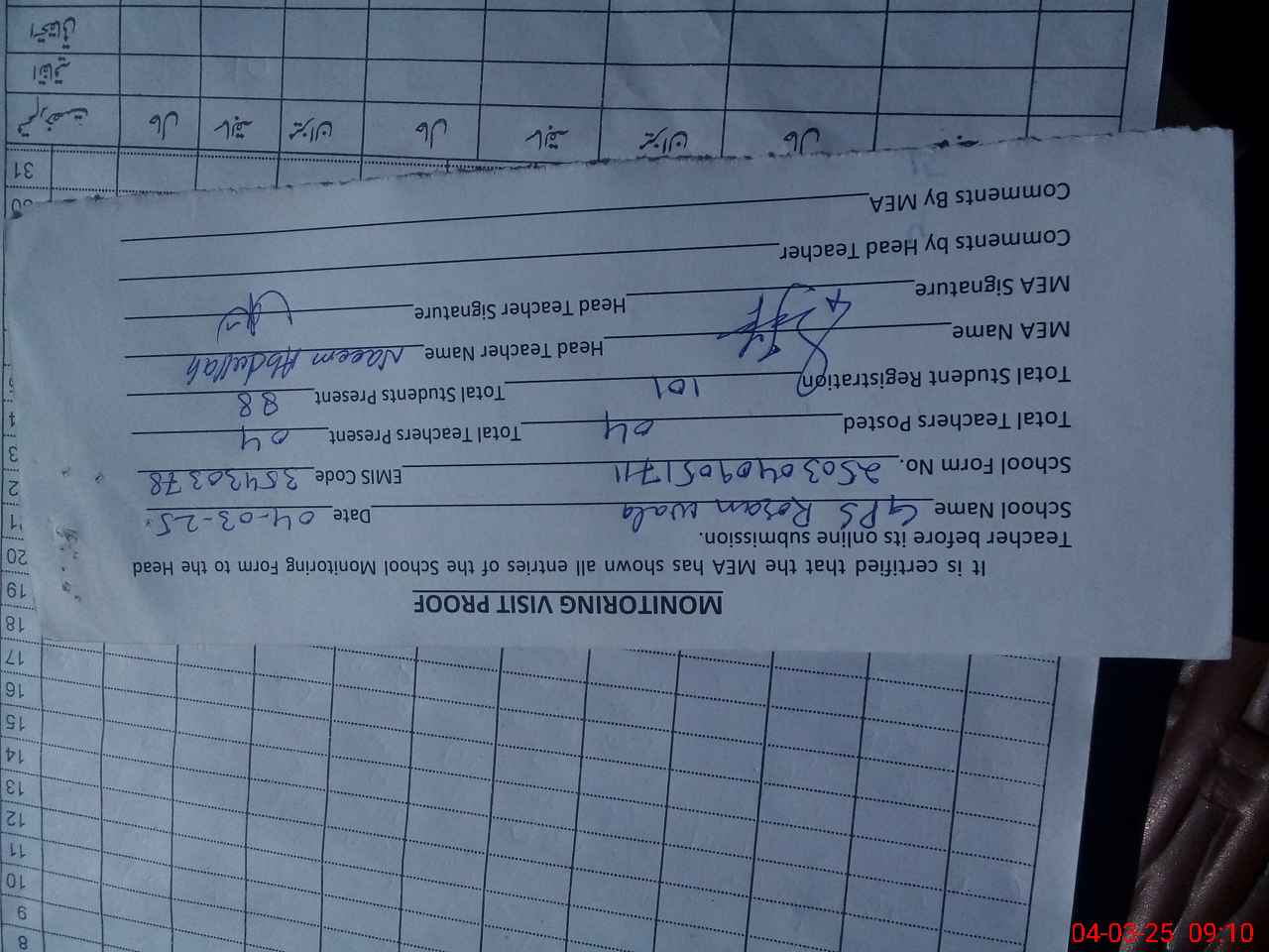 | Attendance Register | Head Teacher | MEA with School | Visit Proof |