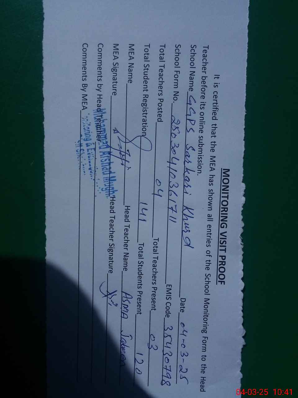 | Attendance Register | Head Teacher | MEA with School | Visit Proof |