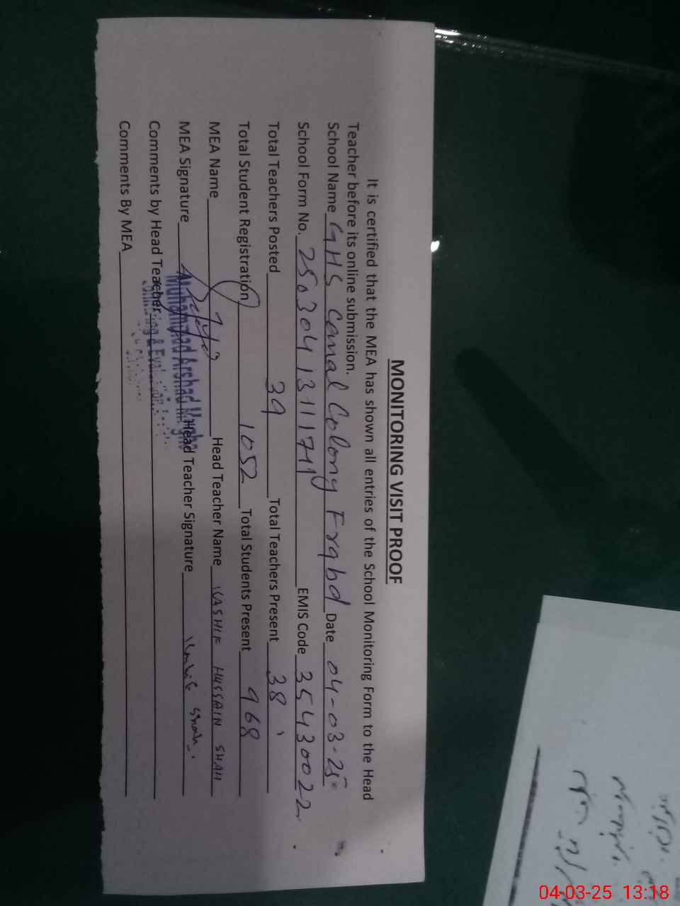 | Attendance Register | Head Teacher | MEA with School | Visit Proof |