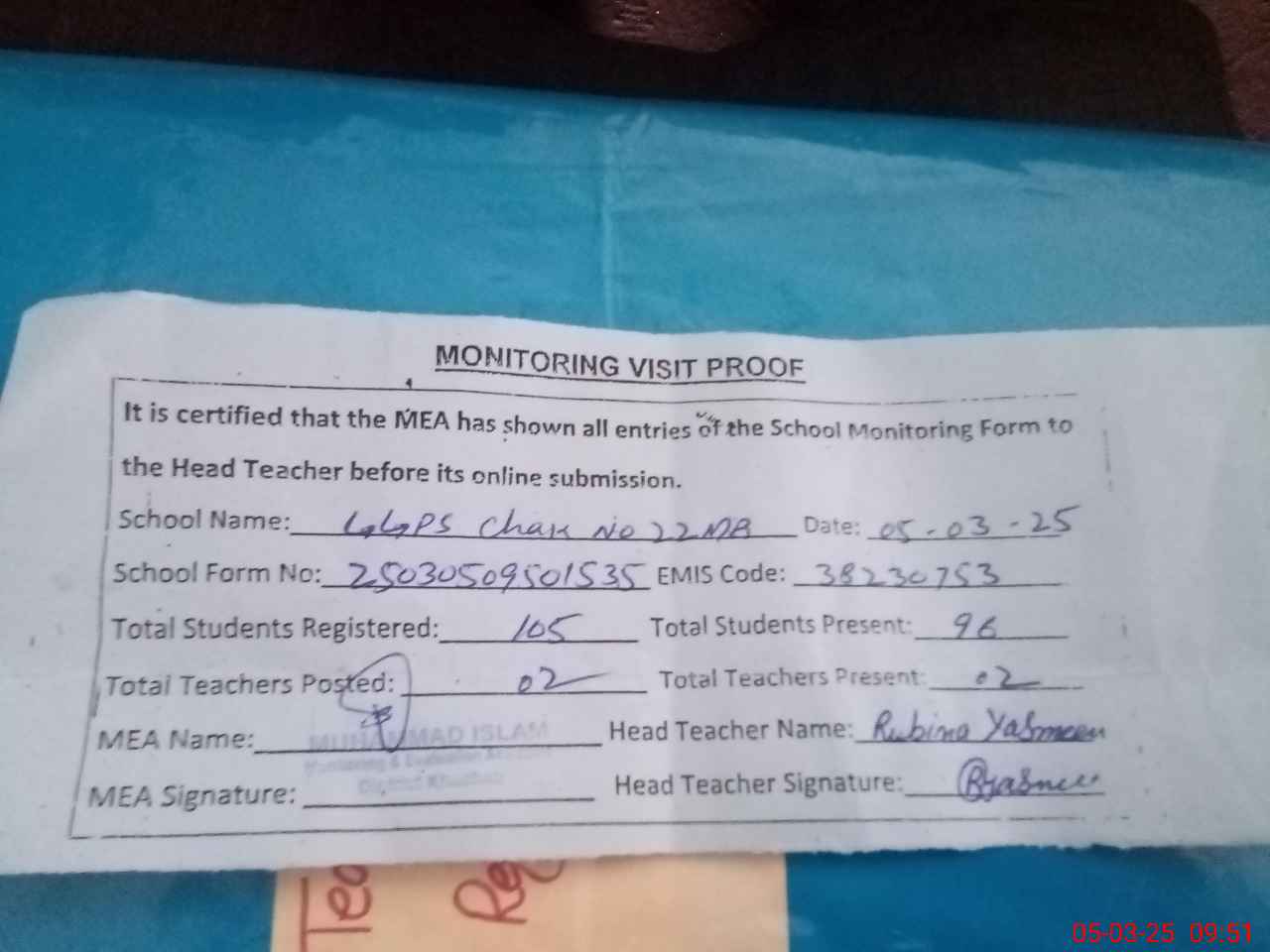 | Attendance Register | Head Teacher | MEA with School | Visit Proof |