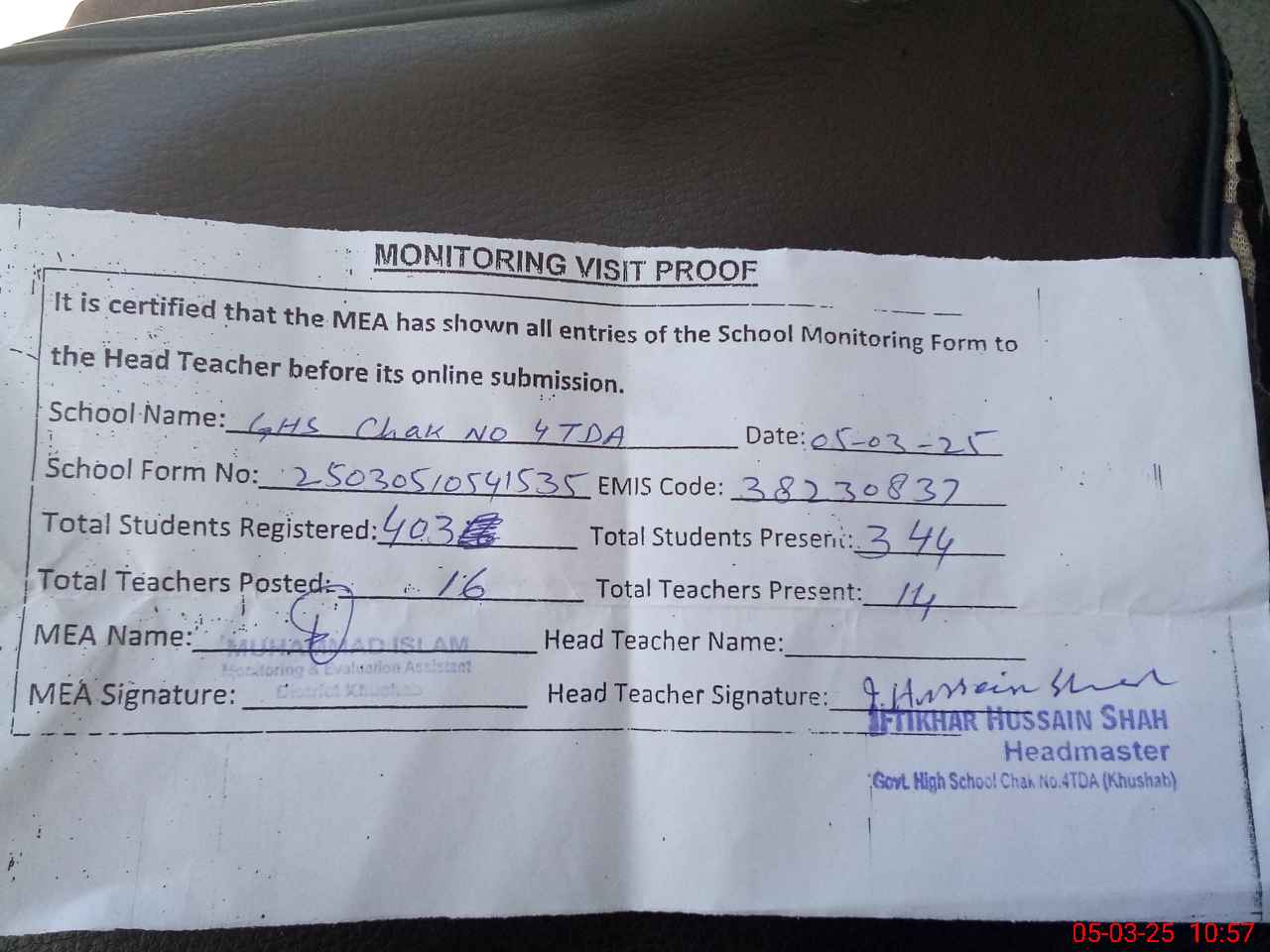 | EMIS Code: 38230837 | Name of School: GHS CHAK NO. 4 TDA | |||