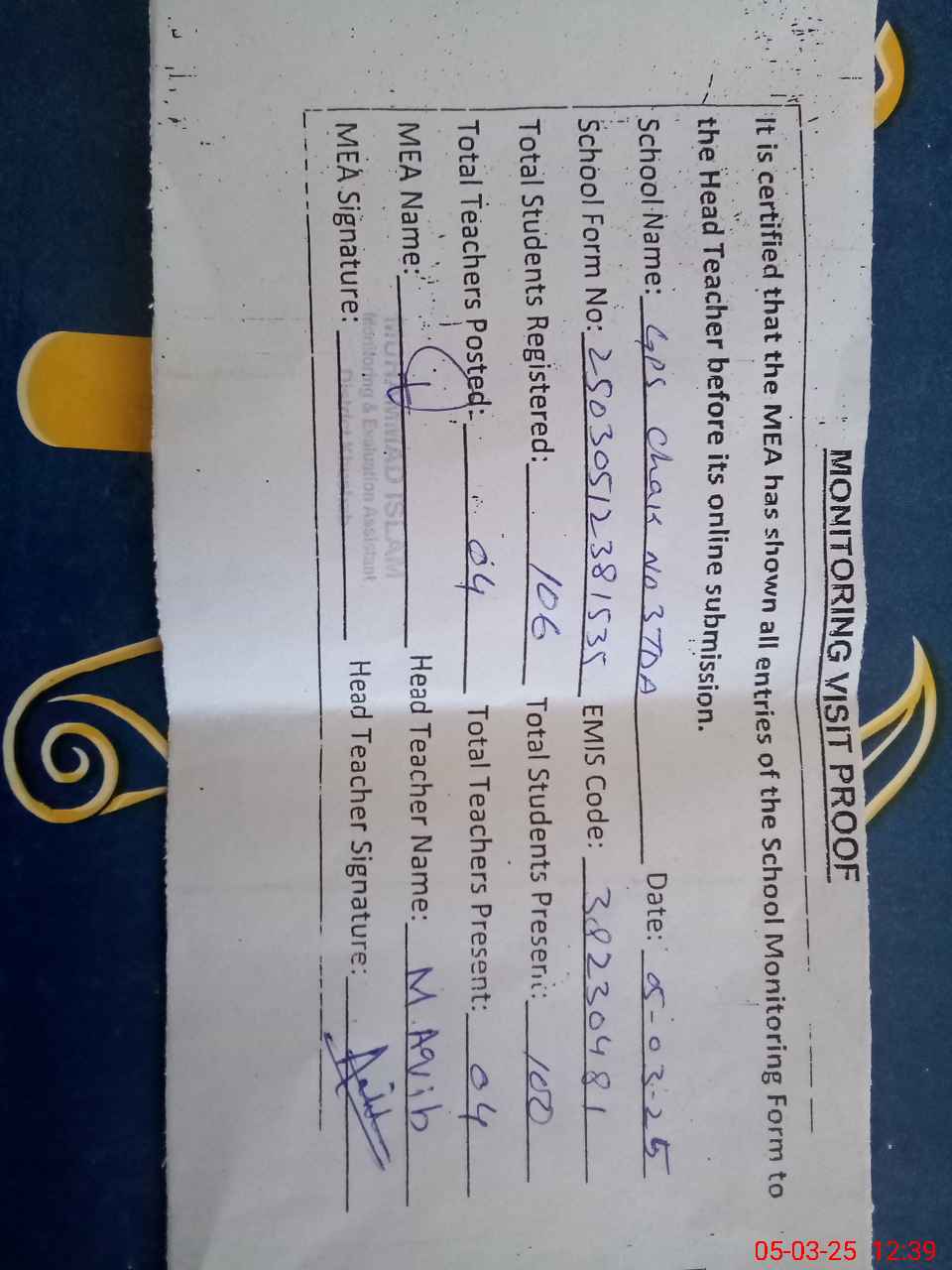 | EMIS Code: 38230481 | Name of School: GPS CHAK NO 3 TDA | |||