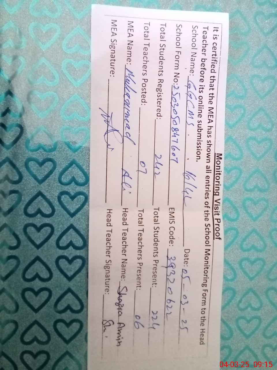| Certified that this School was Inspected by the Undersigned MEA/DMO Today and the Information Stated Above is as Per Record. | |||||