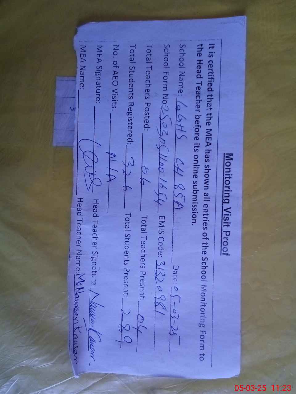 | Attendance Register | Head Teacher | MEA with School | Visit Proof |