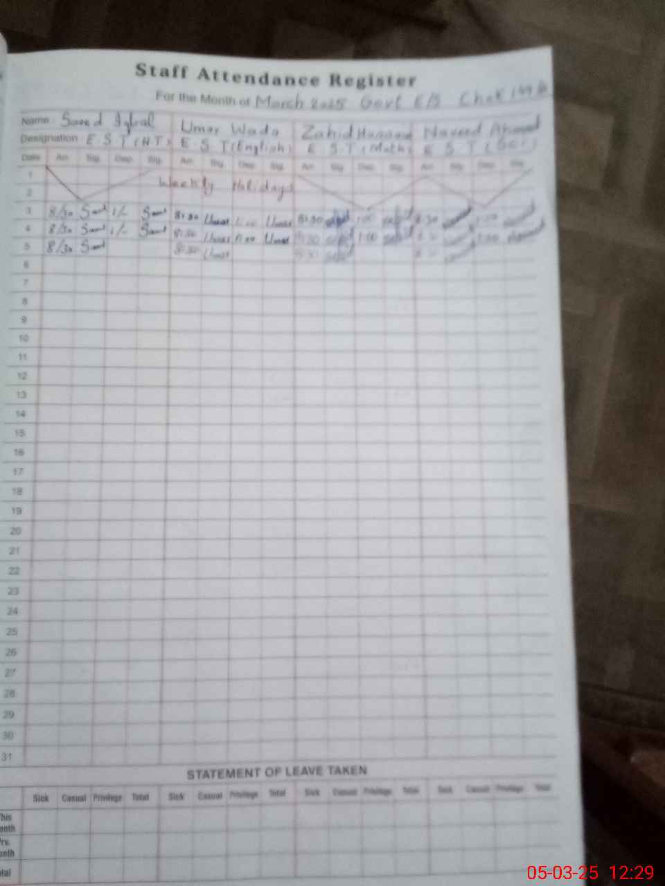 | 31**** | Mu**** Ra**** Ma**** | 1 | 1 | 0 | 0 | 0 | 0 | 0 | 0 | 0 | 0 | 0 | Exam Duty |