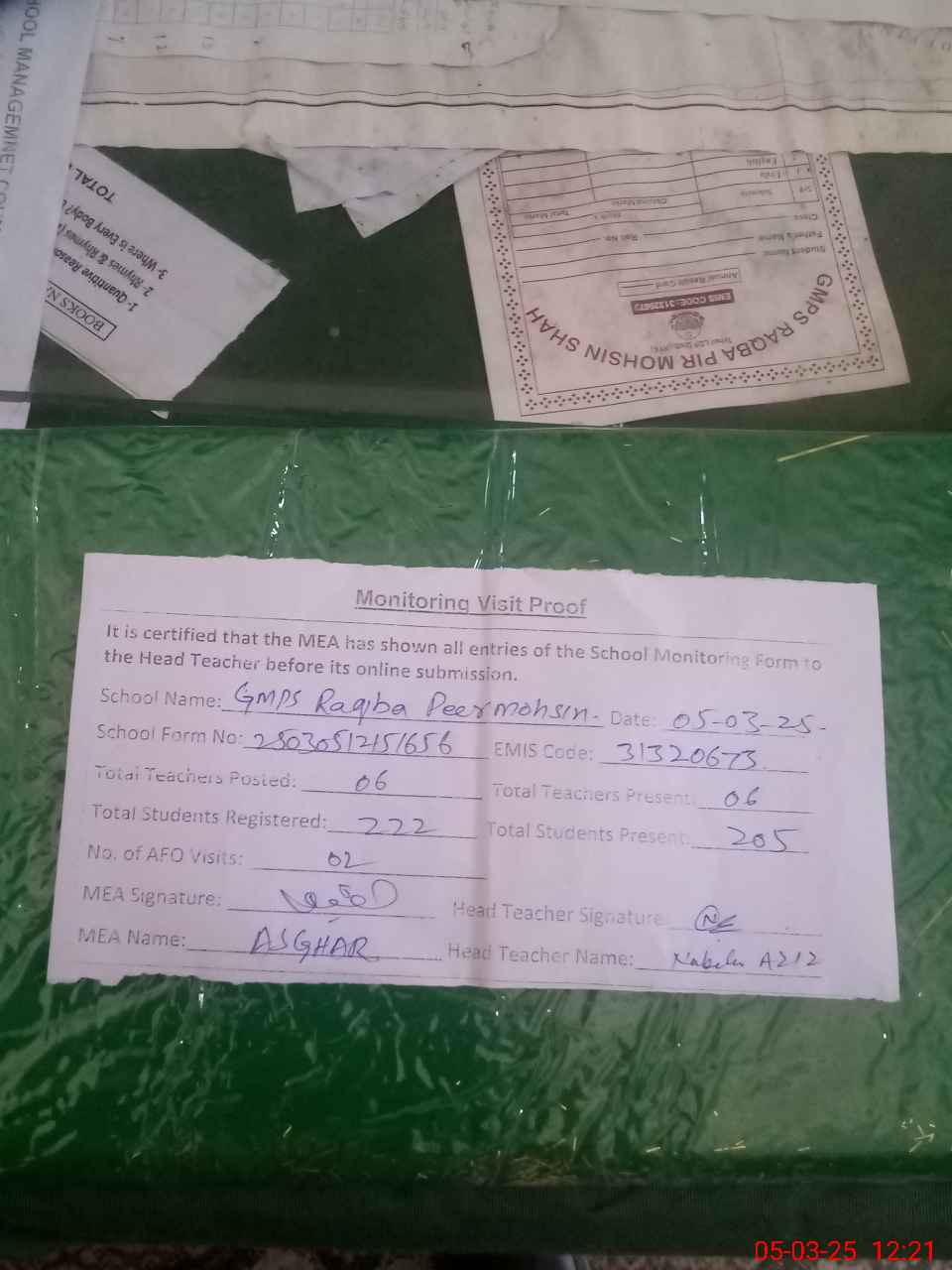 | Attendance Register | Head Teacher | MEA with School | Visit Proof |