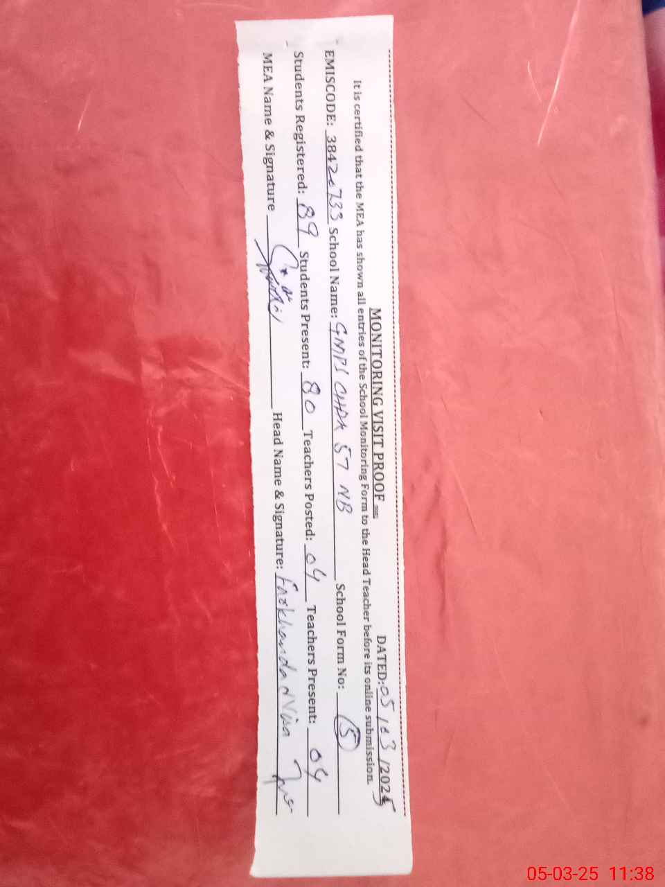 | Attendance Register | Head Teacher | MEA with School | Visit Proof |