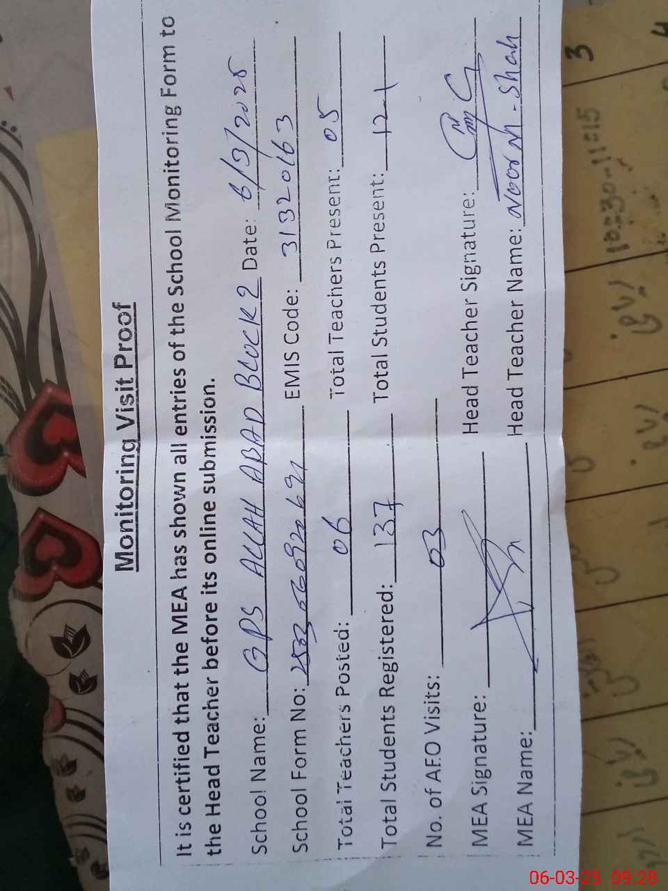 | Attendance Register | Head Teacher | MEA with School | Visit Proof |