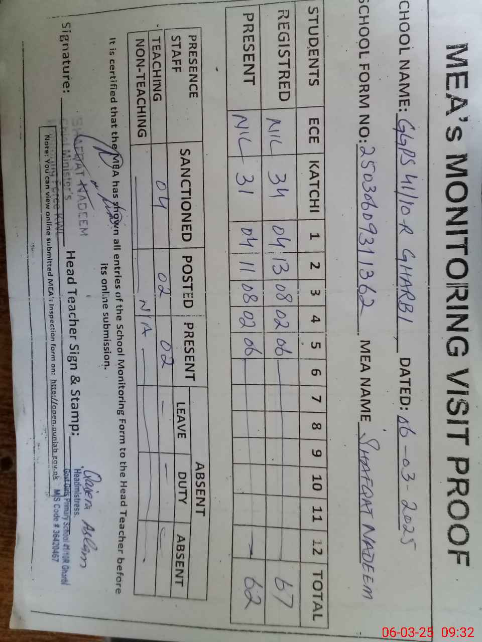 | Attendance Register | Head Teacher | MEA with School | Visit Proof |