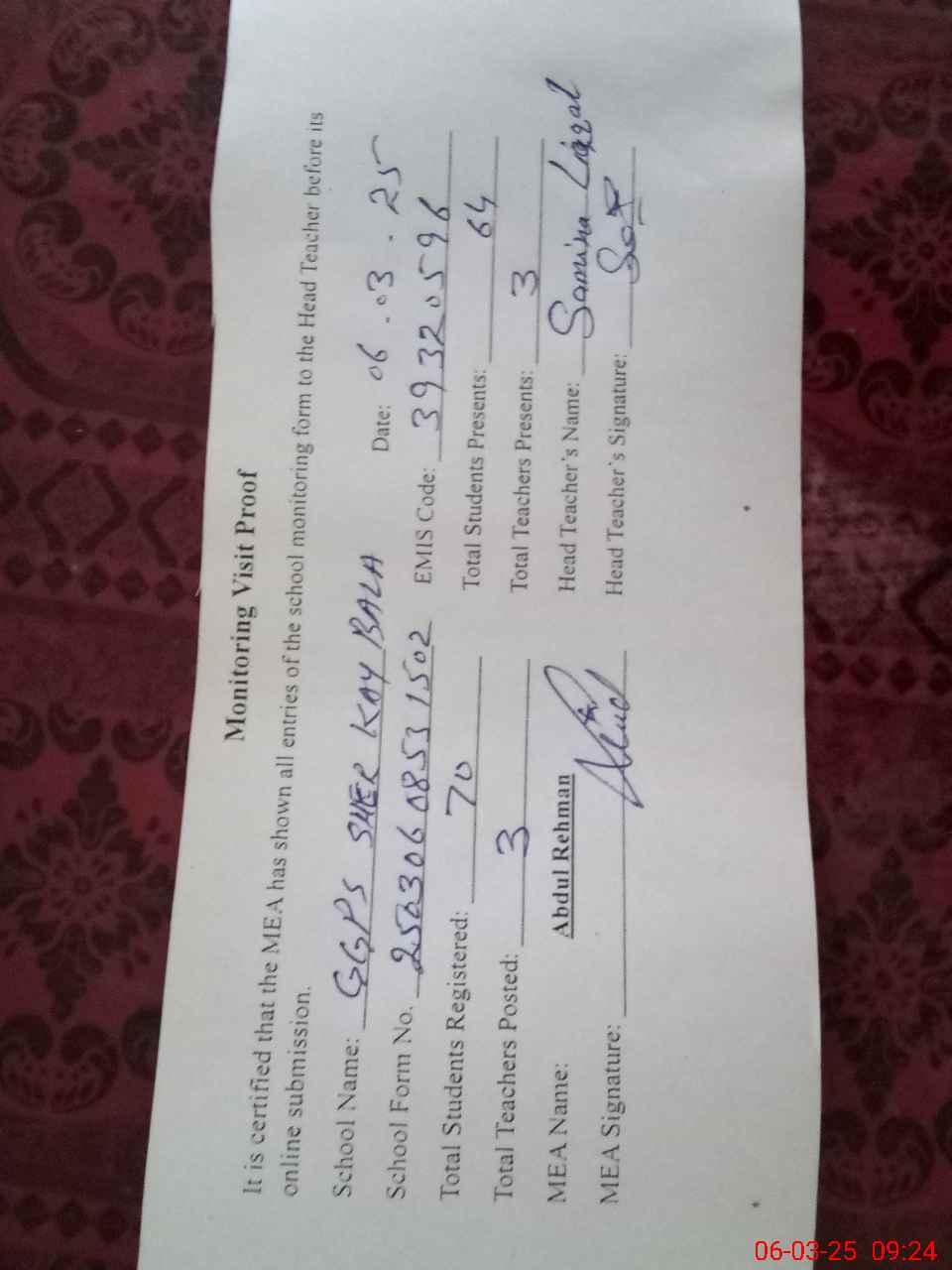 | Attendance Register | Head Teacher | MEA with School | Visit Proof |