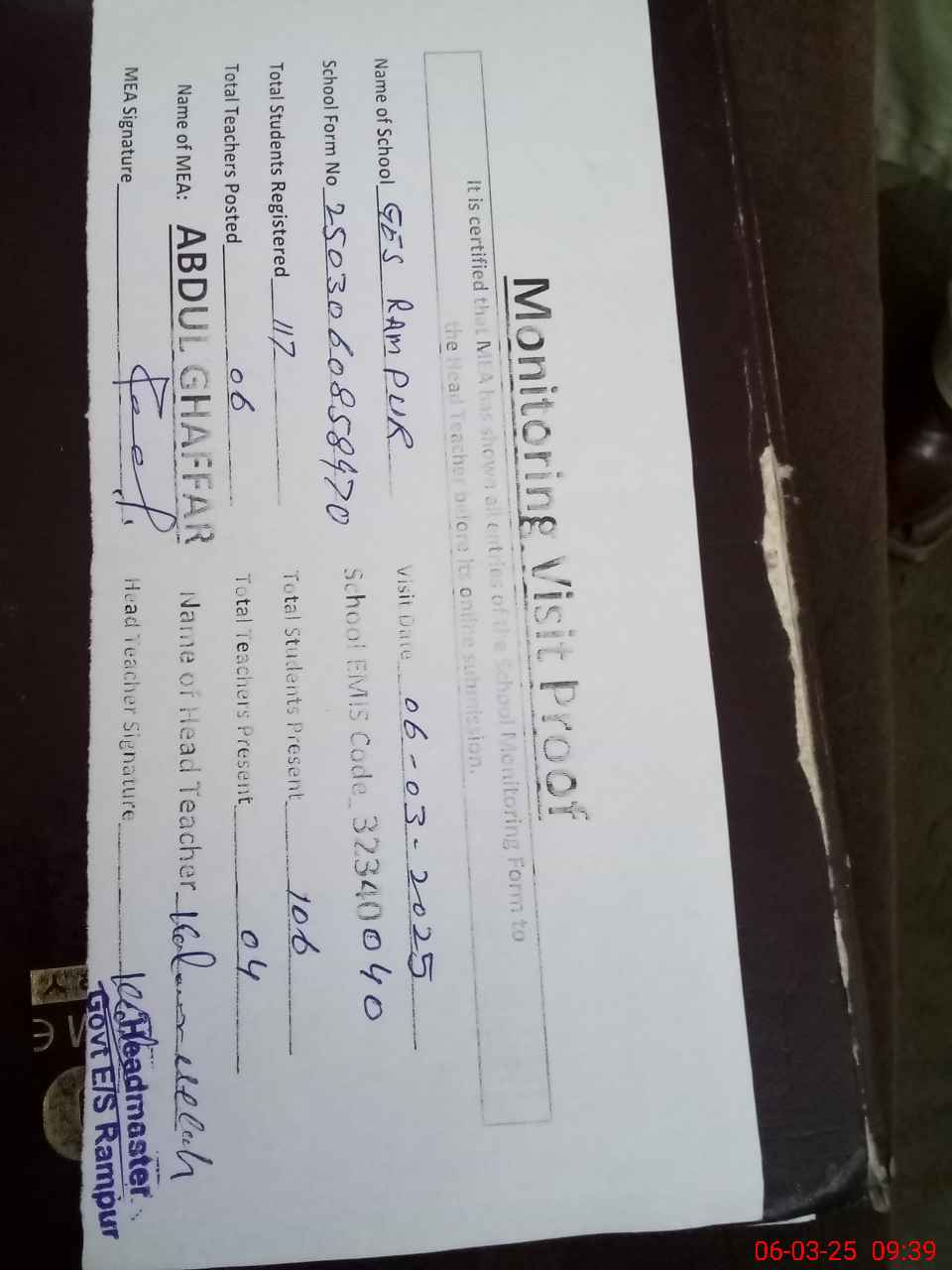 | Attendance Register | Head Teacher | MEA with School | Visit Proof |