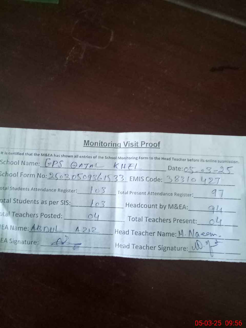| Attendance Register | Head Teacher | MEA with School | Visit Proof |