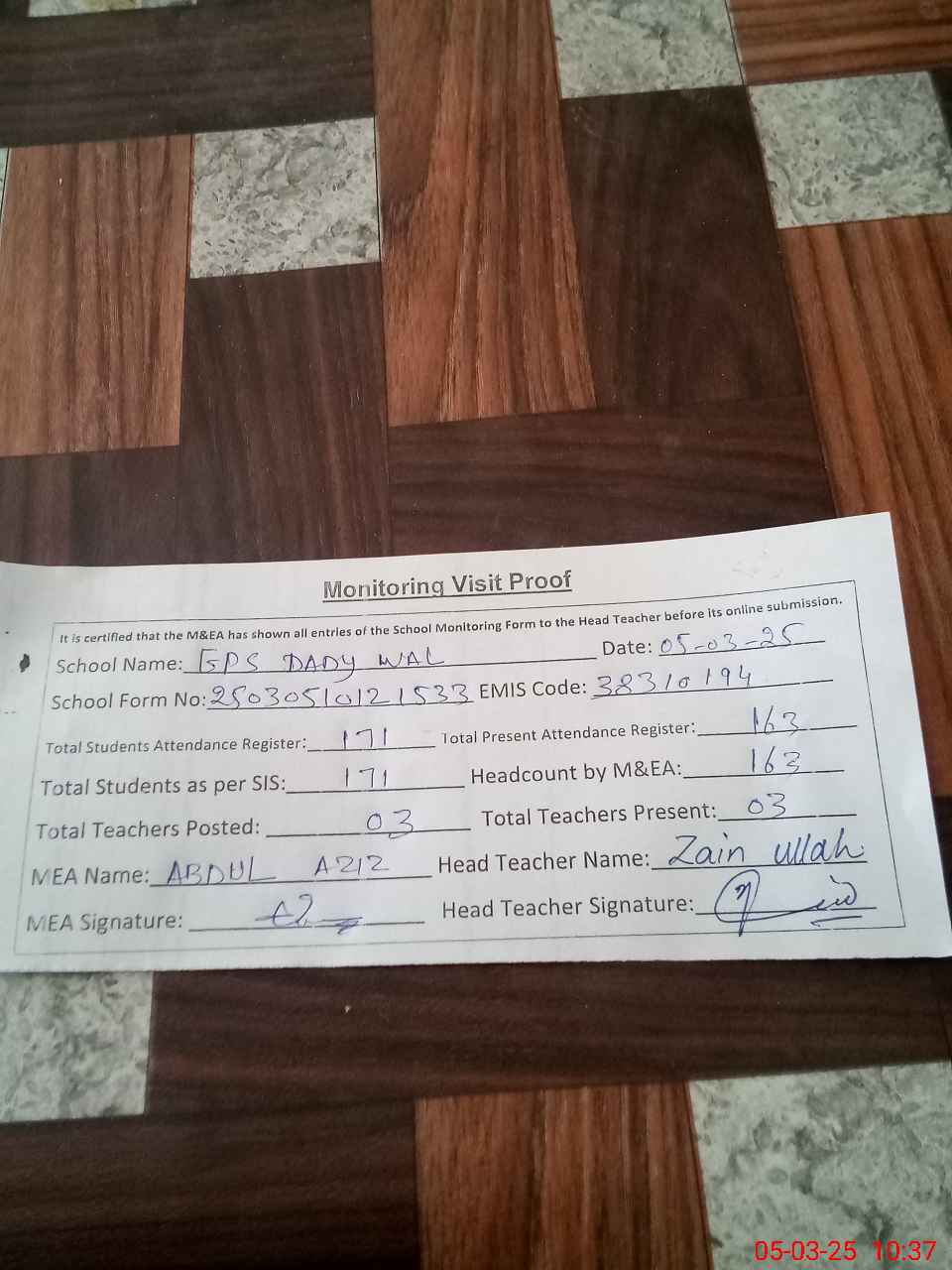 | Attendance Register | Head Teacher | MEA with School | Visit Proof |