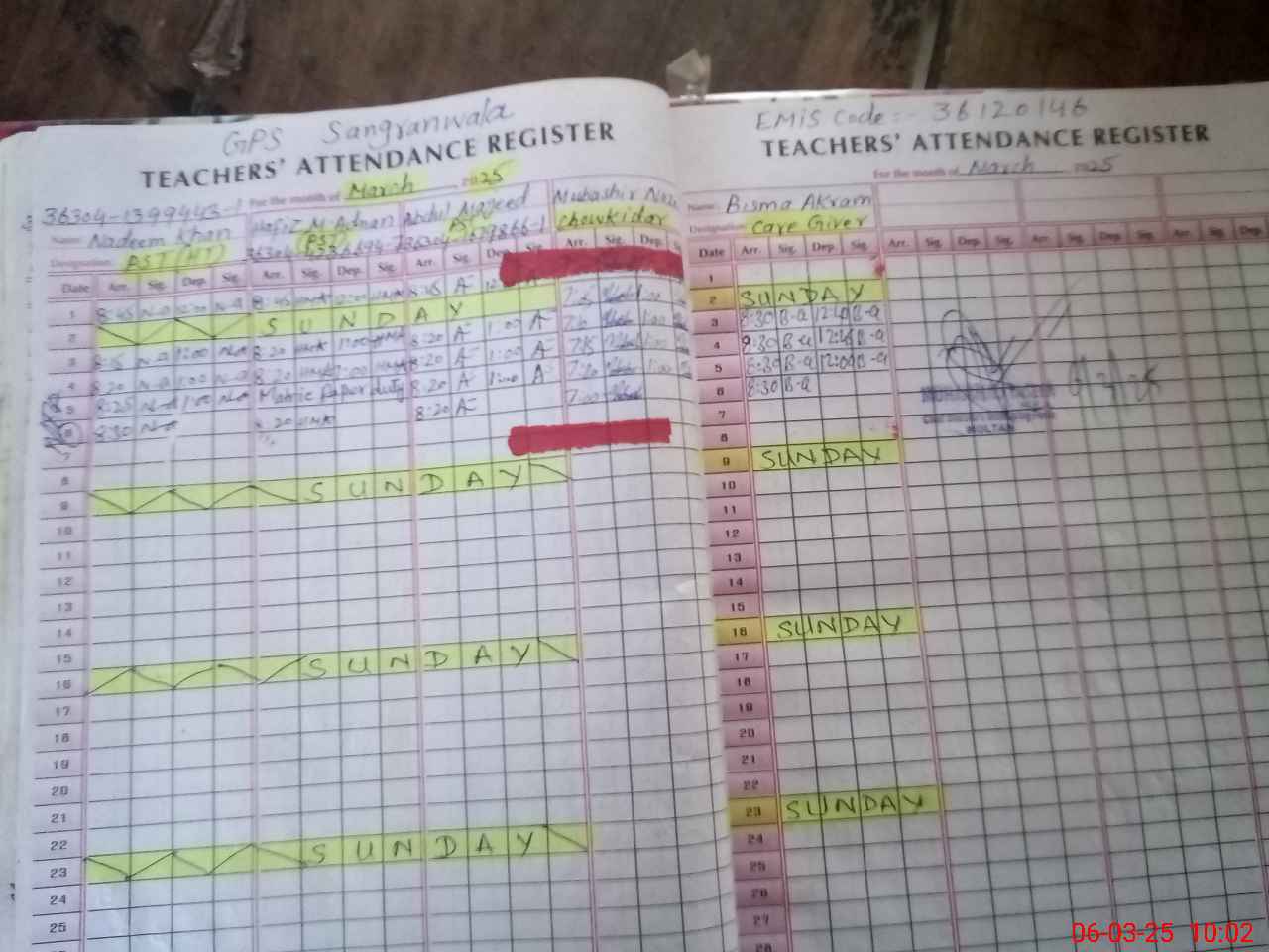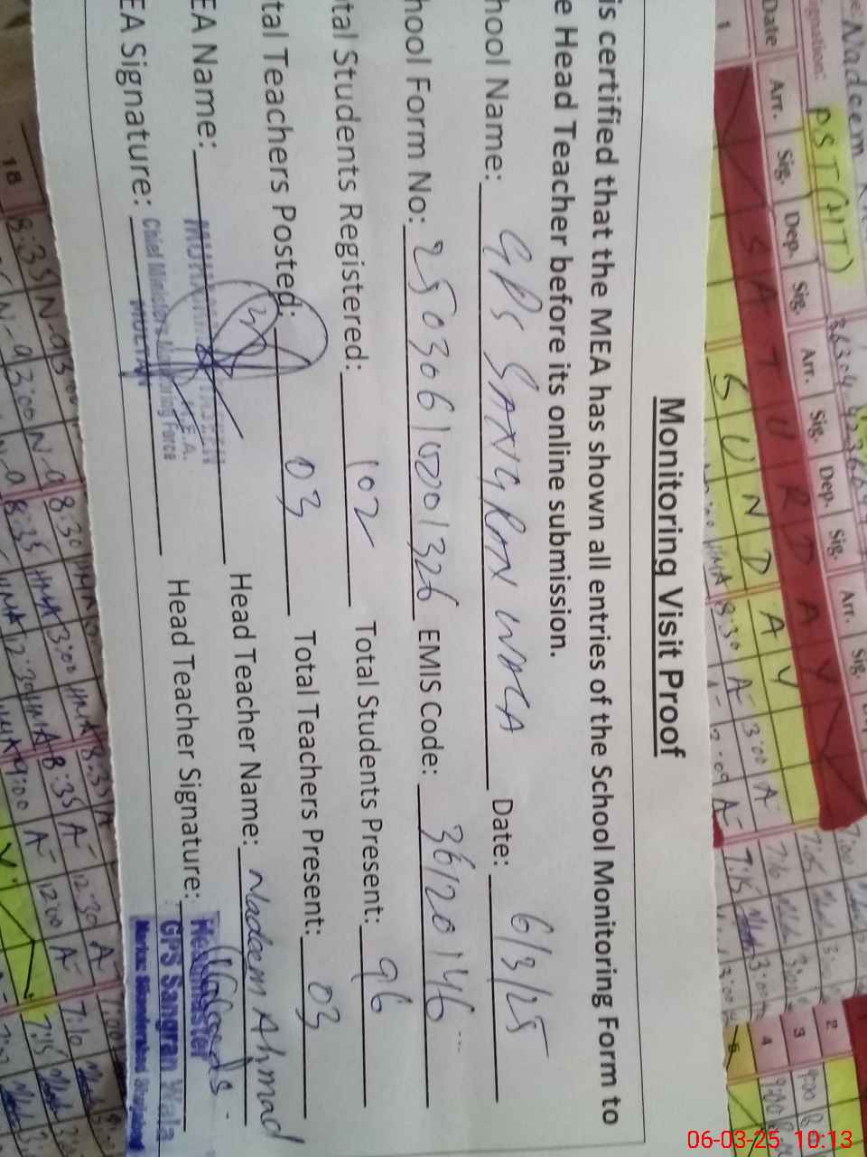 | Attendance Register | Head Teacher | MEA with School | Visit Proof |