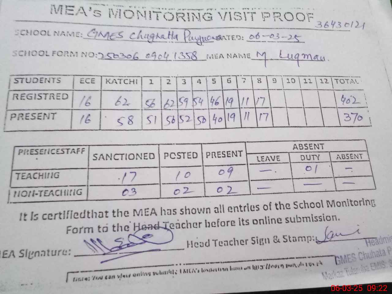 | EMIS Code: 36430121 | Name of School: GMES CHUGHATA PUNJUANA, TULAMBA | |||