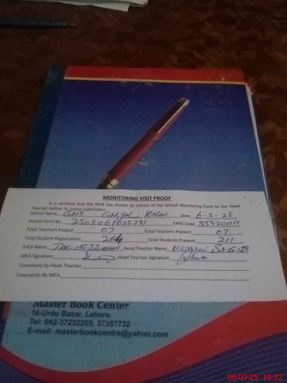 | Attendance Register | Head Teacher | MEA with School | Visit Proof |
