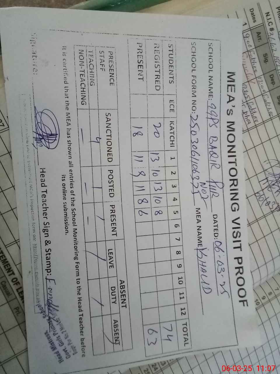 | Attendance Register | Head Teacher | MEA with School | Visit Proof |