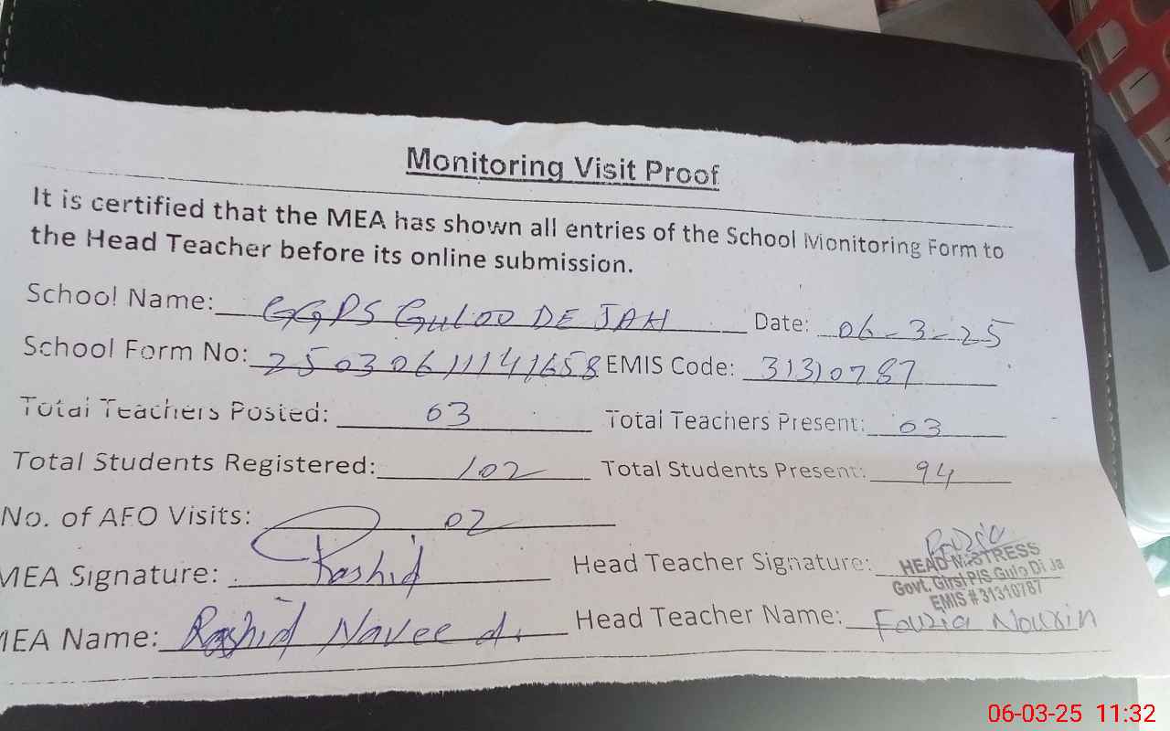 | Attendance Register | Head Teacher | MEA with School | Visit Proof |
