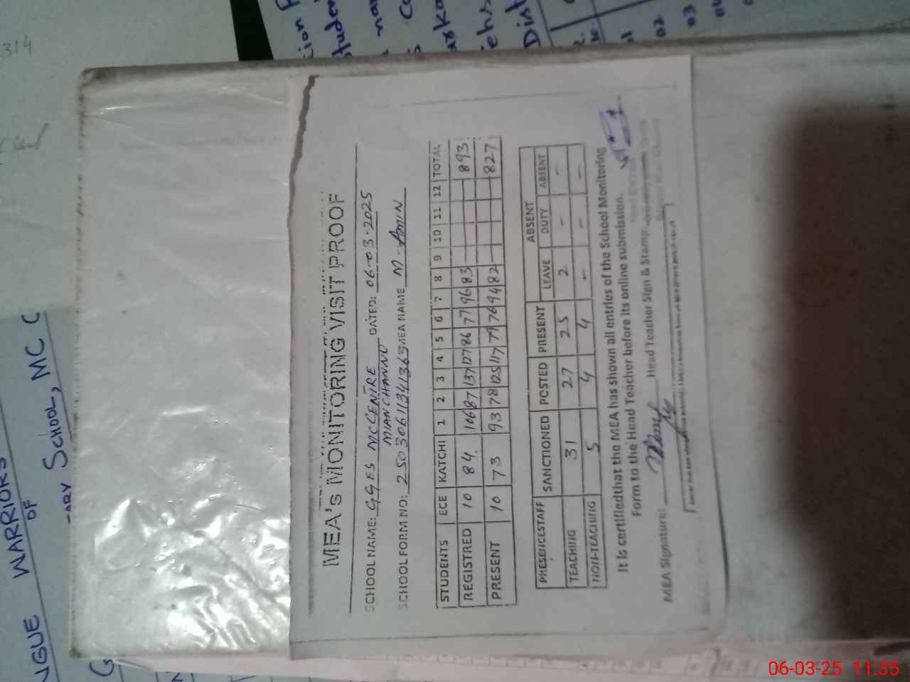| Attendance Register | Head Teacher | MEA with School | Visit Proof |