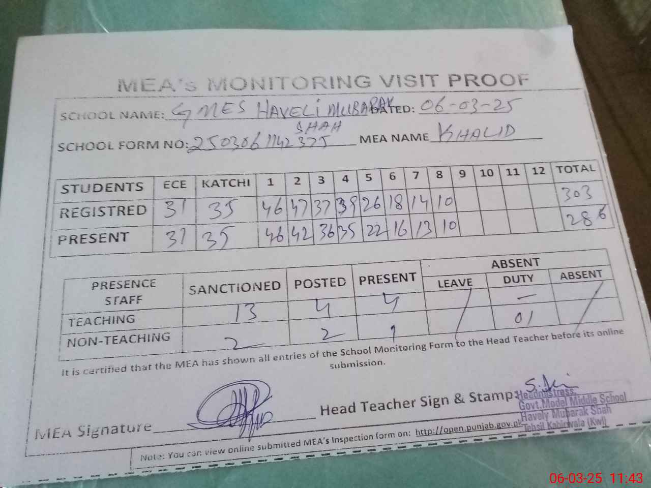| Certified that this School was Inspected by the Undersigned MEA/DMO Today and the Information Stated Above is as Per Record. | |||||