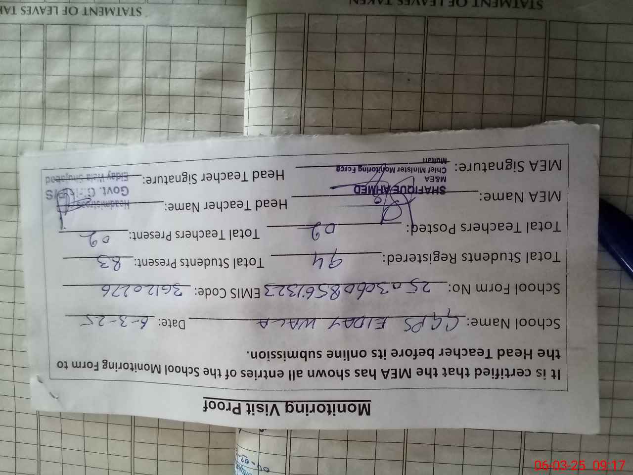 | Attendance Register | Head Teacher | MEA with School | Visit Proof |