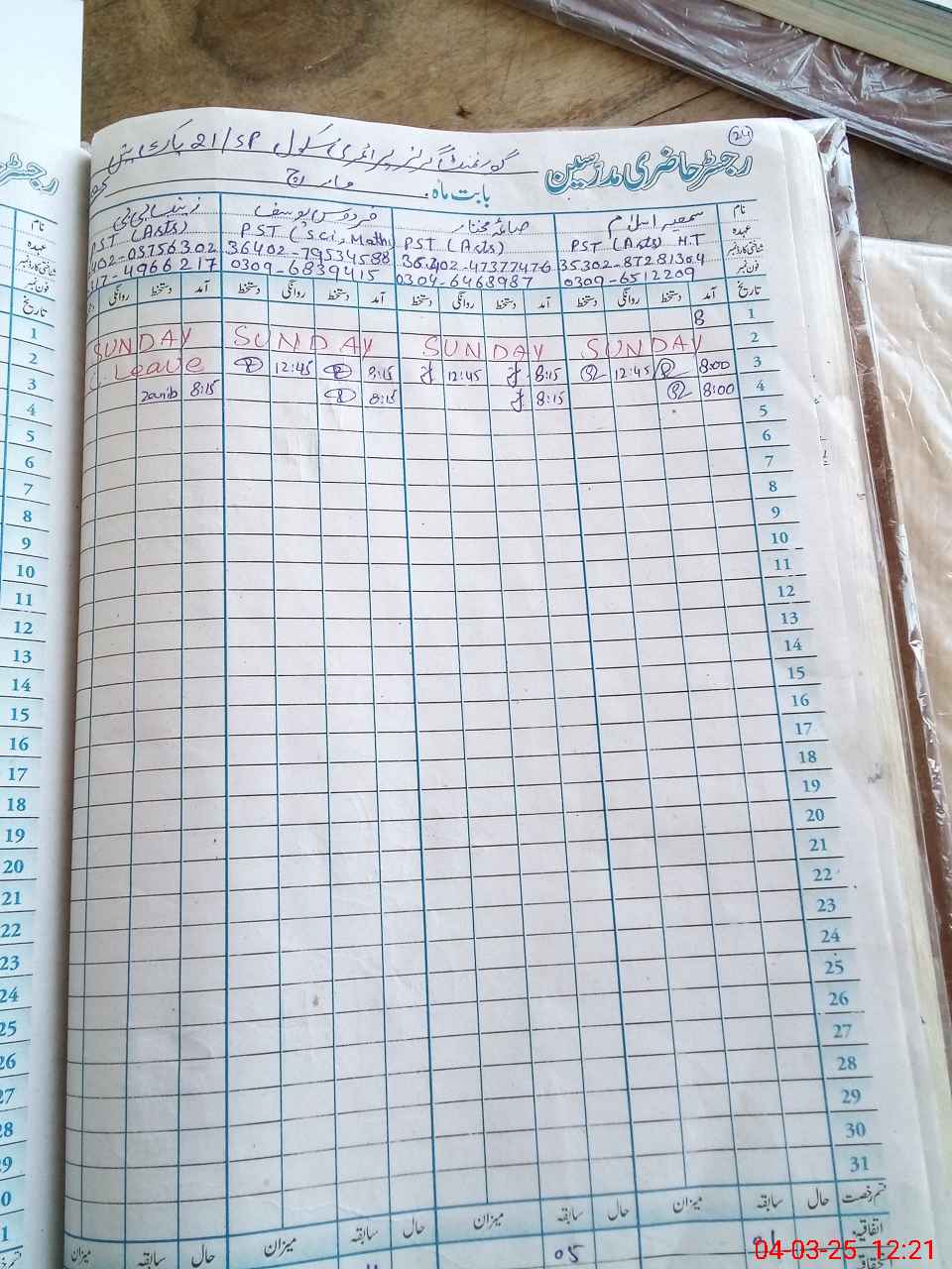 | CNIC | Full Name | Designation | R/C | Absence During Last Calender Month |