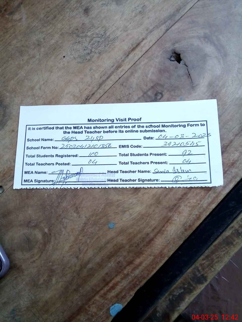 | Attendance Register | Head Teacher | MEA with School | Visit Proof |