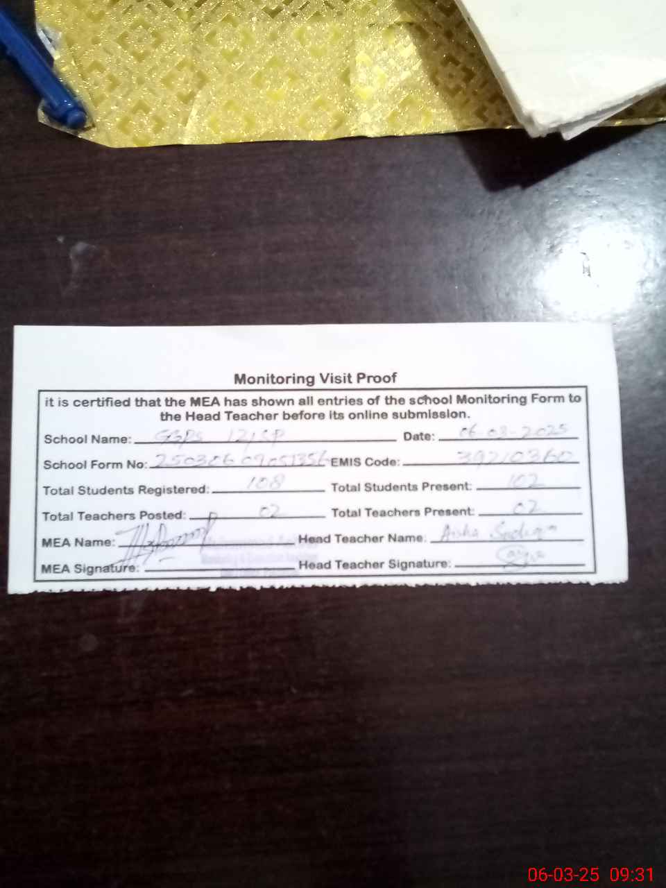 | Attendance Register | Head Teacher | MEA with School | Visit Proof |