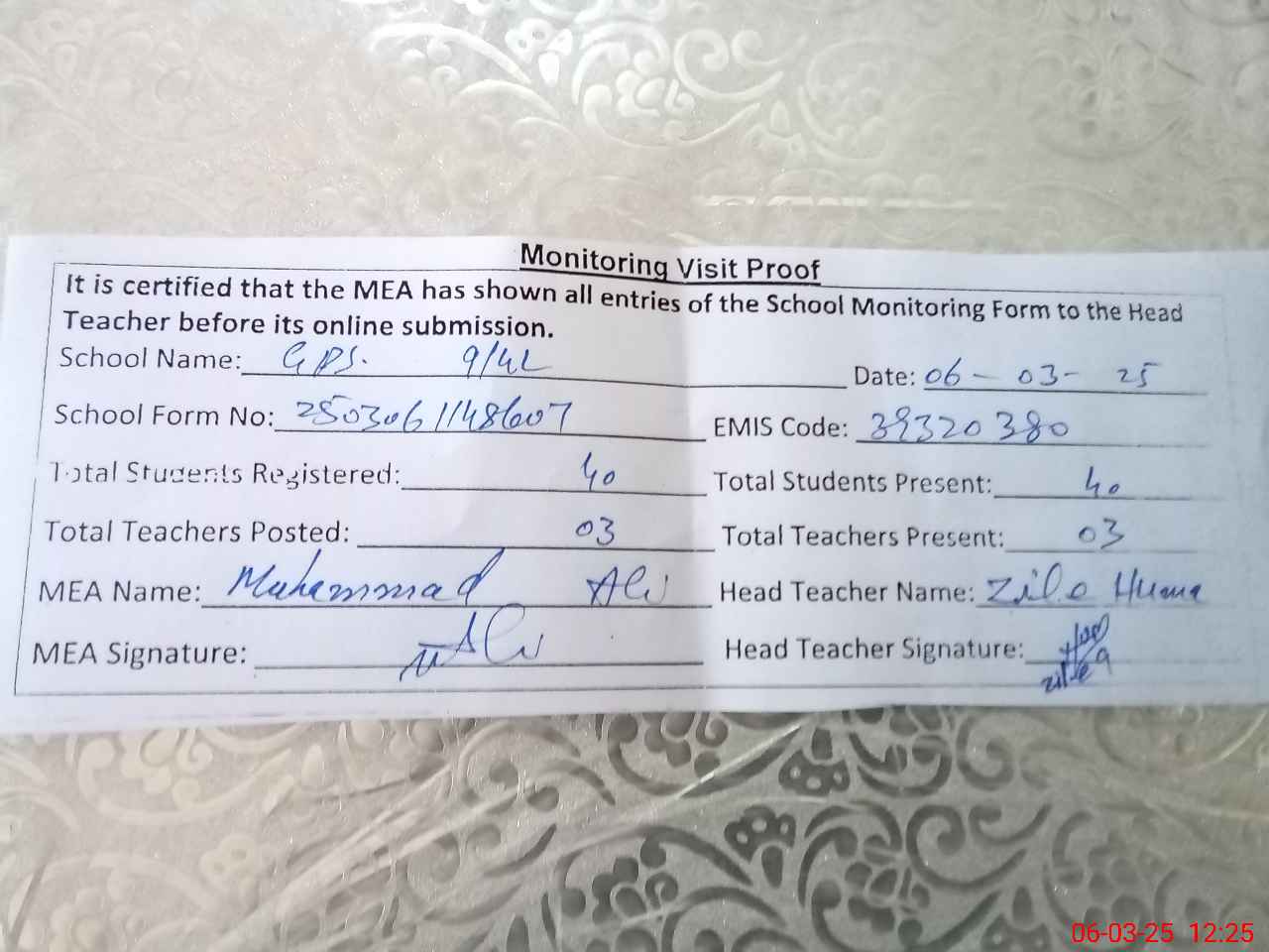 | Attendance Register | Head Teacher | MEA with School | Visit Proof |
