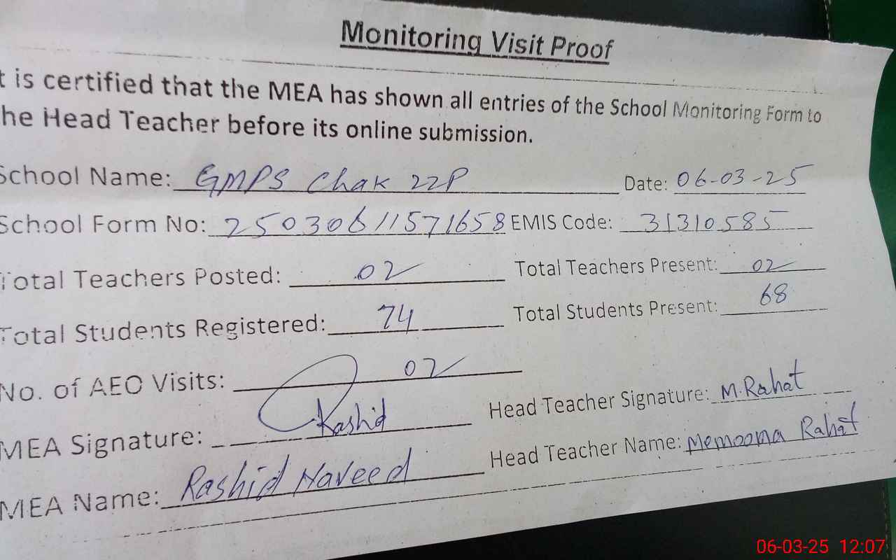 | Attendance Register | Head Teacher | MEA with School | Visit Proof |