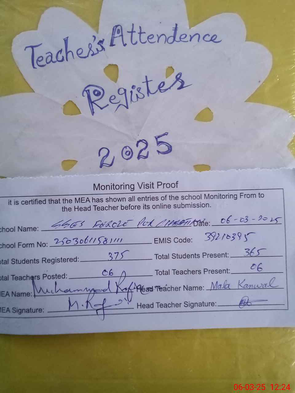 | Attendance Register | Head Teacher | MEA with School | Visit Proof |