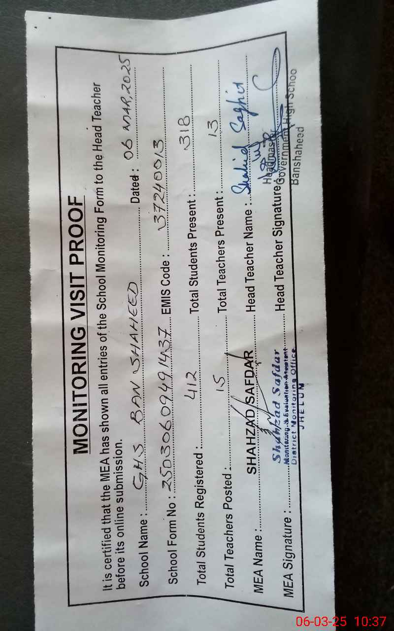 | EMIS Code: 37240013 | Name of School: GHS BAN SHAHEED | |||