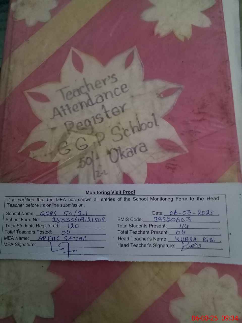 | Attendance Register | Head Teacher | MEA with School | Visit Proof |