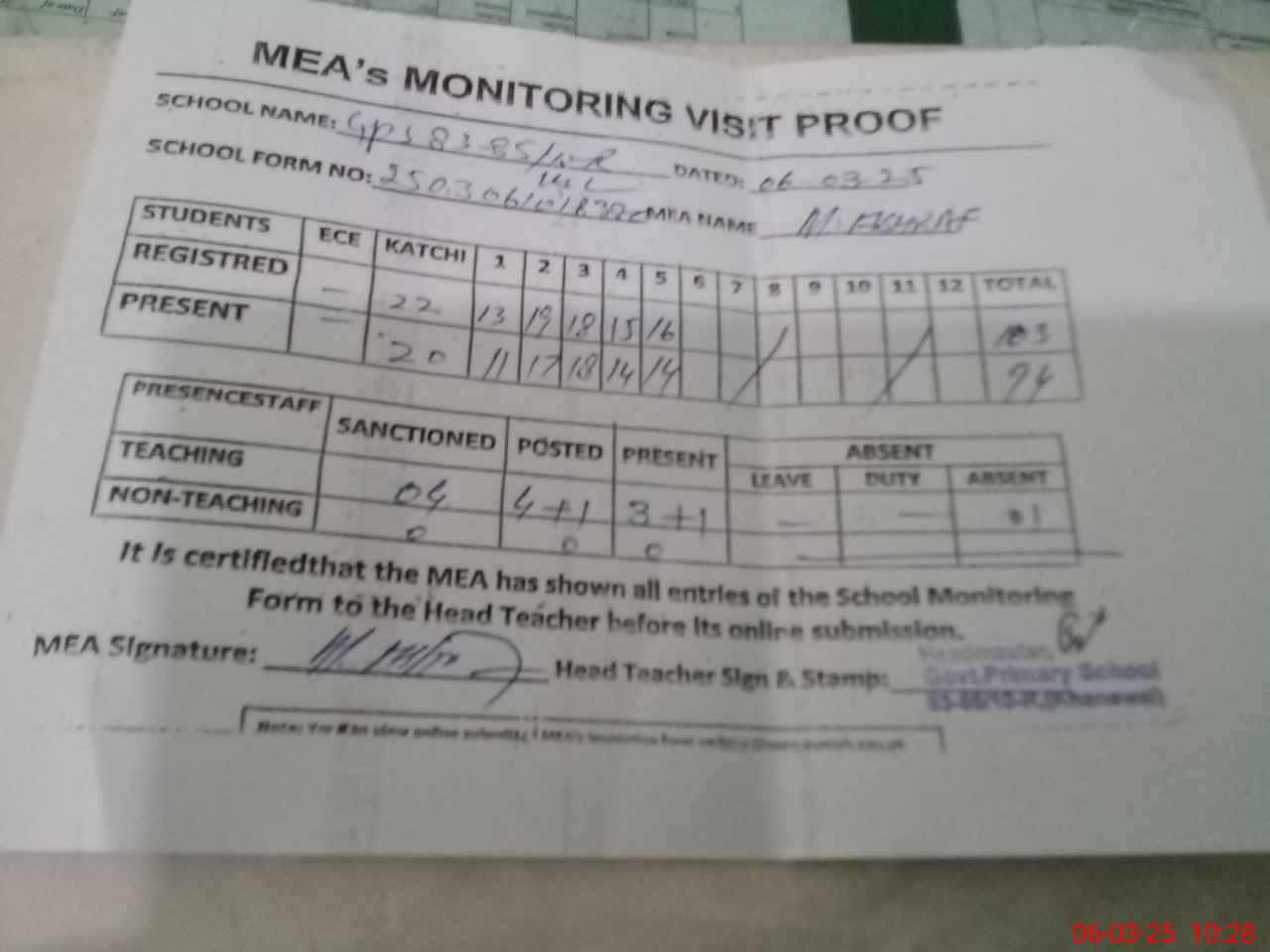 | Attendance Register | Head Teacher | MEA with School | Visit Proof |