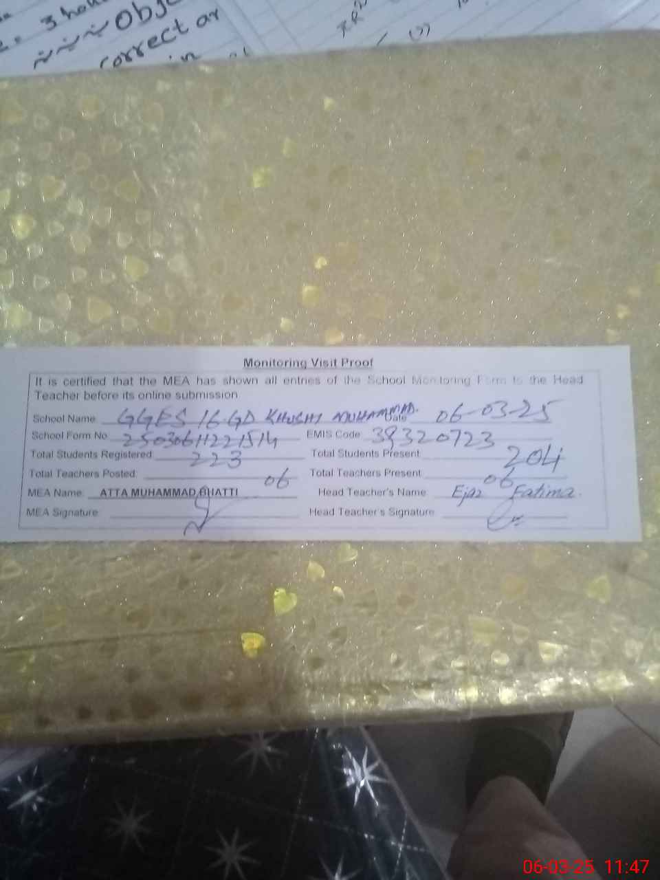 | EMIS Code: 39320723 | Name of School: GGES KHUSHI MUHAMMAD 16/G.D | |||