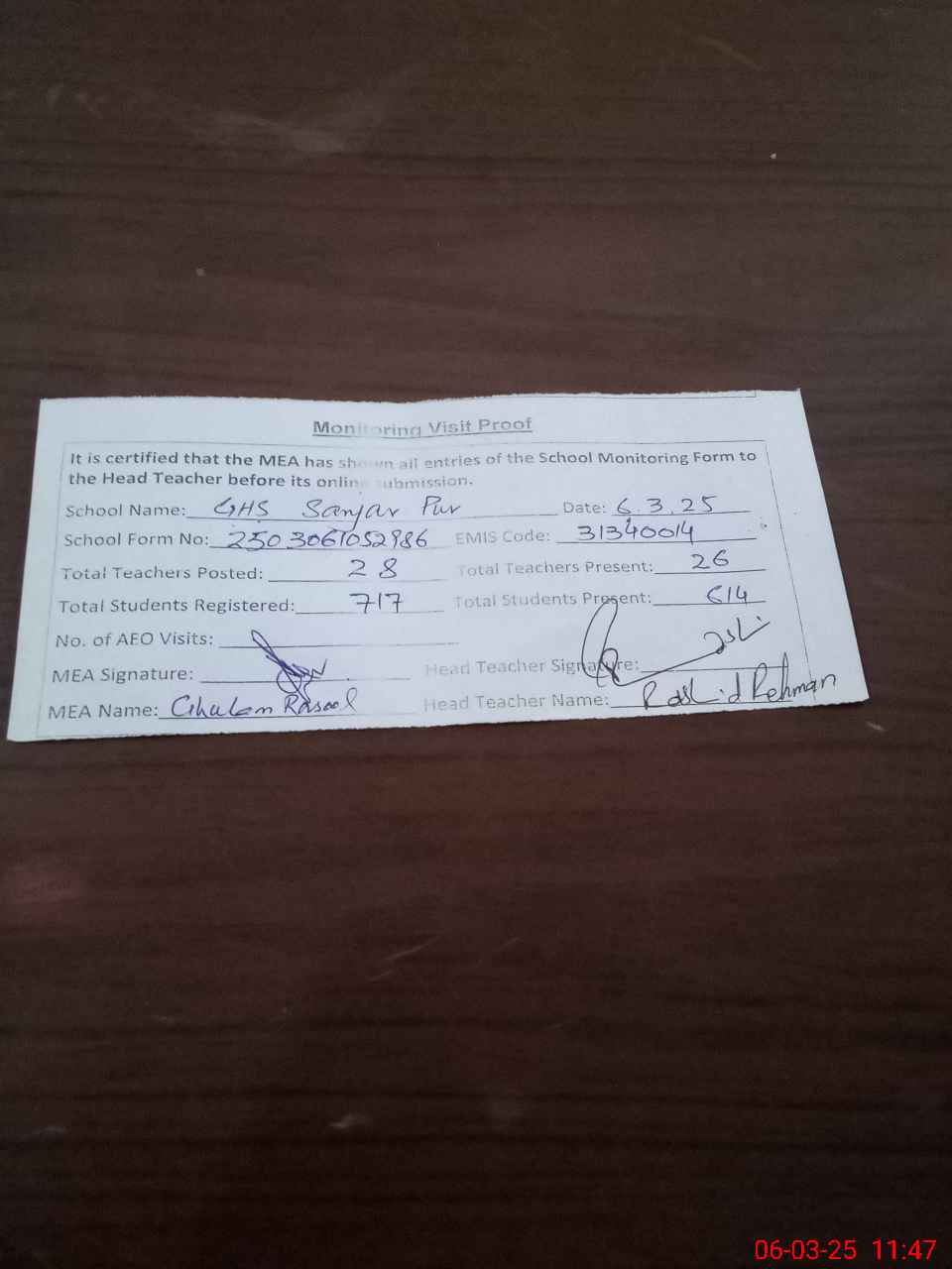 | EMIS Code: 31340014 | Name of School: GHS SANJAR PUR | |||