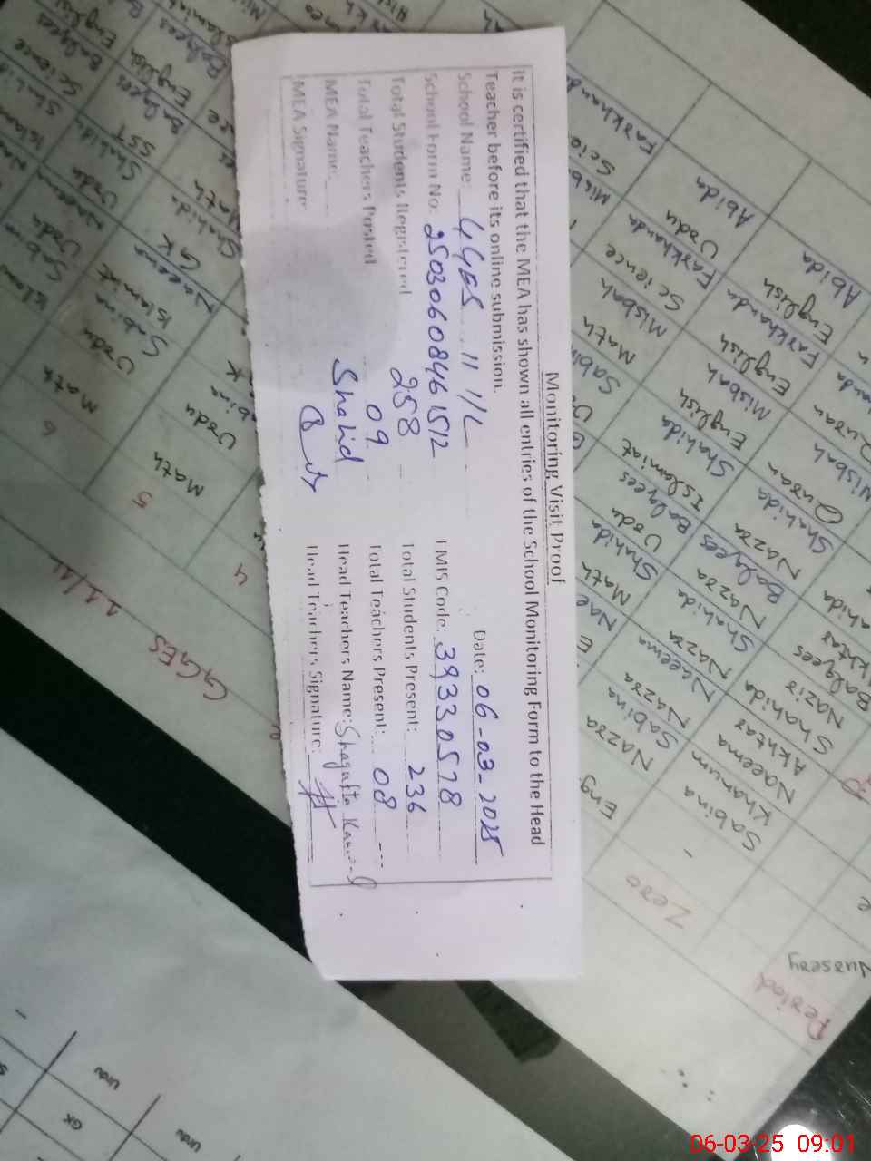 | Attendance Register | Head Teacher | MEA with School | Visit Proof |